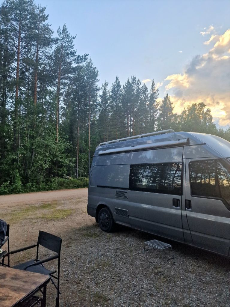 Tegen de avond merken we dat de app van park4night niet meer werkt. Er is een storing die ze maar niet opgelost krijgen. Lastig. We proberen nu te zoeken via andere kanalen maar komen zo op de camperplekken en campings die we juist níet willen. We willen gewoon iets simpels. Je merkt pas hoe afhankelijk je bent van het internet als je het niet meer hebt. Uiteindelijk vind ik per toeval een plaats enkele kilometers rijden. Kleine plek, in bos, bij water, vlakbij een visclub. Geen foto’s, geen reviews, niks. Enkel een adres. We riskeren het maar. De laatste kilometers naar de plek gaan via een grindweg, maar het is goed begaanbaar en gelukkig is het niet te drassig.