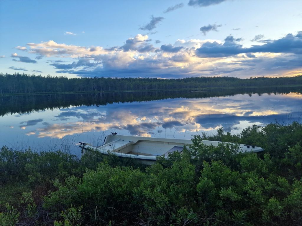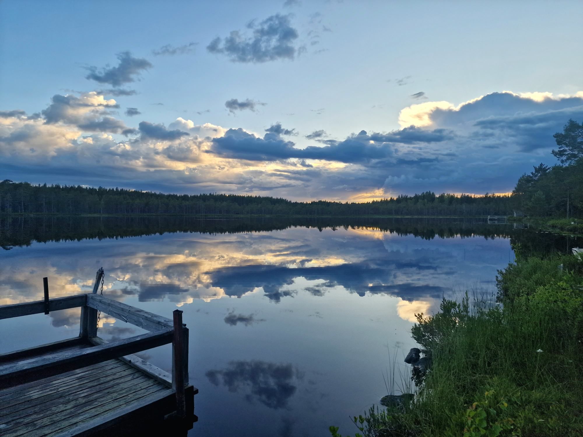 Tussen het muggenmeppen door nuttigen we ons avondeten. Het overschot van gisteren, dus koken moest ik niet. Daarna even de benen strekken, wandelschoenen aan en naar het meer. Dit klinkt sportiever dan het was. Het is amper 100 meter lopen vanaf onze bus. Langs de helft van het meer is een houten wandelpad voorzien, en hier en daar wat inhammen of kleine steigers. Ik vermoed voor de vissers. De verschillende kleuren van de lucht weerspiegelen mooi op het heldere water. Wat hebben we weer een prachtig stukje gevonden. Even verderop is een houten hut, met een tafel en een grote open haard waar je kunt grillen. Waarschijnlijk ook weer vooral vis hier.