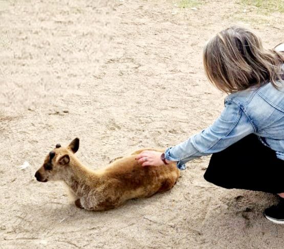 Eerst de uitleg over de rendieren. Ze stelt ons al meteen gerust door te zeggen dat het vegetariërs zijn, dus we moeten niet bang zijn. Da’s makkelijk gezegd, schrik heb ik toch wel. Ik kom niet graag dichtbij zo’n grote beesten. Gewapend met elk een tak met blaadjes gaan we de poort door. Al direct hebben 2 rendieren de lekkere hapjes gezien en komen op ons af gelopen. Voor de duidelijkheid, ik heb het over de takken met blaadjes. Ik houd de tak stevig vast, zoals geïnstrueerd, en voel me best heldhaftig dat ik niet wegloop. De reden dat je de tak stevig vast moet houden is omdat een rendier de bladeren er niet af kan bijten maar er af trekt. Daardoor bijten ze ook niet in je vingers, hooguit wat sabbelen. Tegen dat ‘mijn rendier’ bijna aan het einde van de tak is, geef ik gauw de tak terug aan de medewerkster. ‘Klaar!’ Zeg ik. Ze begreep het. ‘Mijn rendier’ ziet nieuwe groene blaadjes binnenkomen en gaat er weer vandoor. Ik kan nog net een foto maken van Luc met ‘zijn rendier’. De volwassen rendieren zijn hun wintervacht aan het verliezen, vandaar de kale plekken. Een stukje verderop ligt een jong rendiertje relaxt in de zon. Het is net een maand oud. Zo schattig! En wat minder eng om te aaien. Zo zacht!