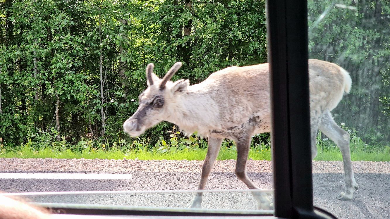 Een nog jong rendier steekt ineens op het gemak de straat over. We vertragen. Als we elkaar passeren kijken we hem aan en hij kijkt ons aan. Ik kan nog snel een foto maken. Prachtige beesten. Een stukje verder zien we plots een eland. Deze is helaas wel schichtig en vlucht het bos in. Ik was te laat met m’n foto.