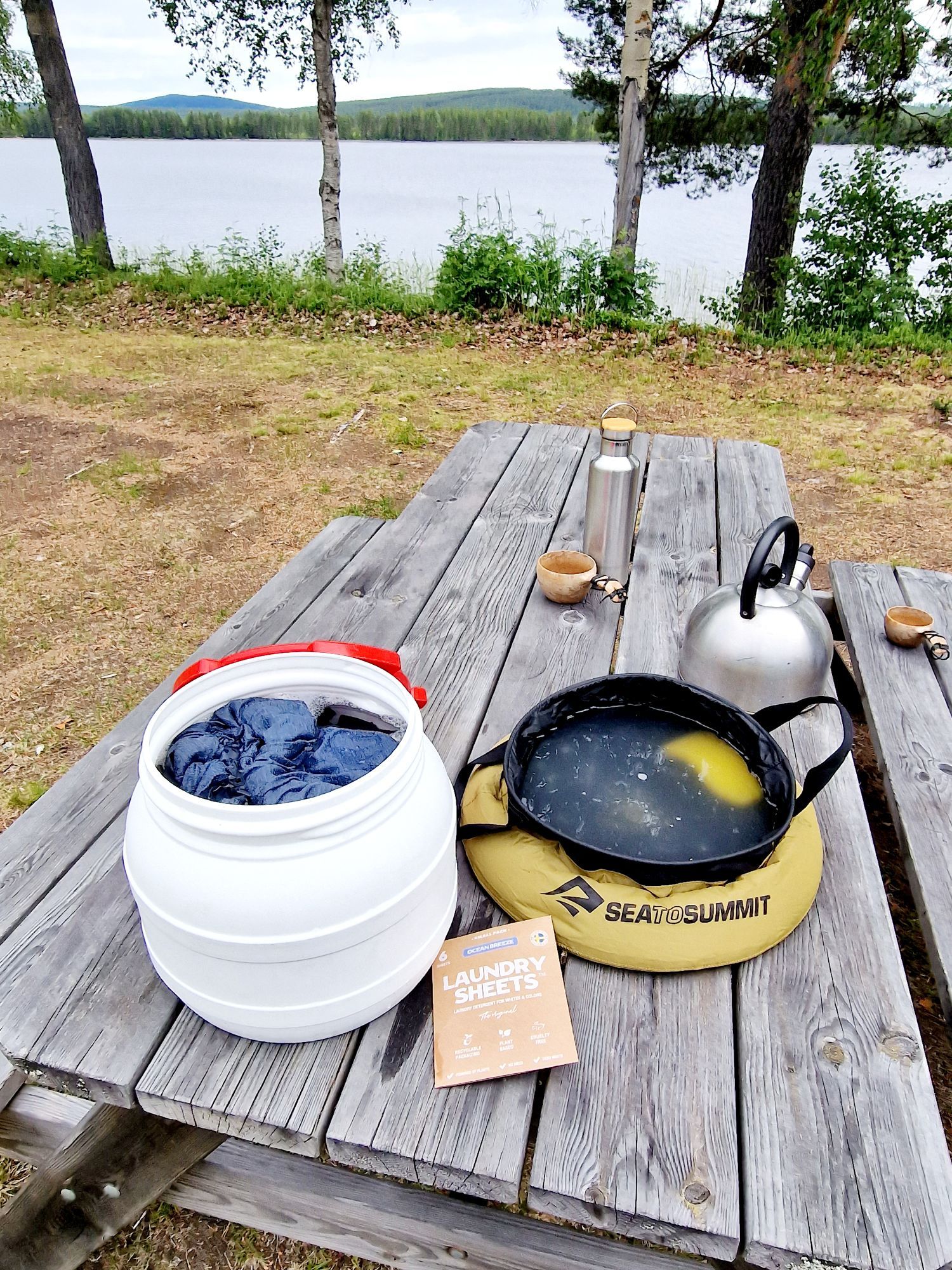 Ik sta nog eens vroeg op en begin direct aan wat huishoudelijke klusjes. Ik zet een thermos koffie, veeg de bus uit, haal warm water uit de campingkeuken voor de afwas en de was. Het is nu droog buiten met een beetje zon, dus dat komt goed uit.
