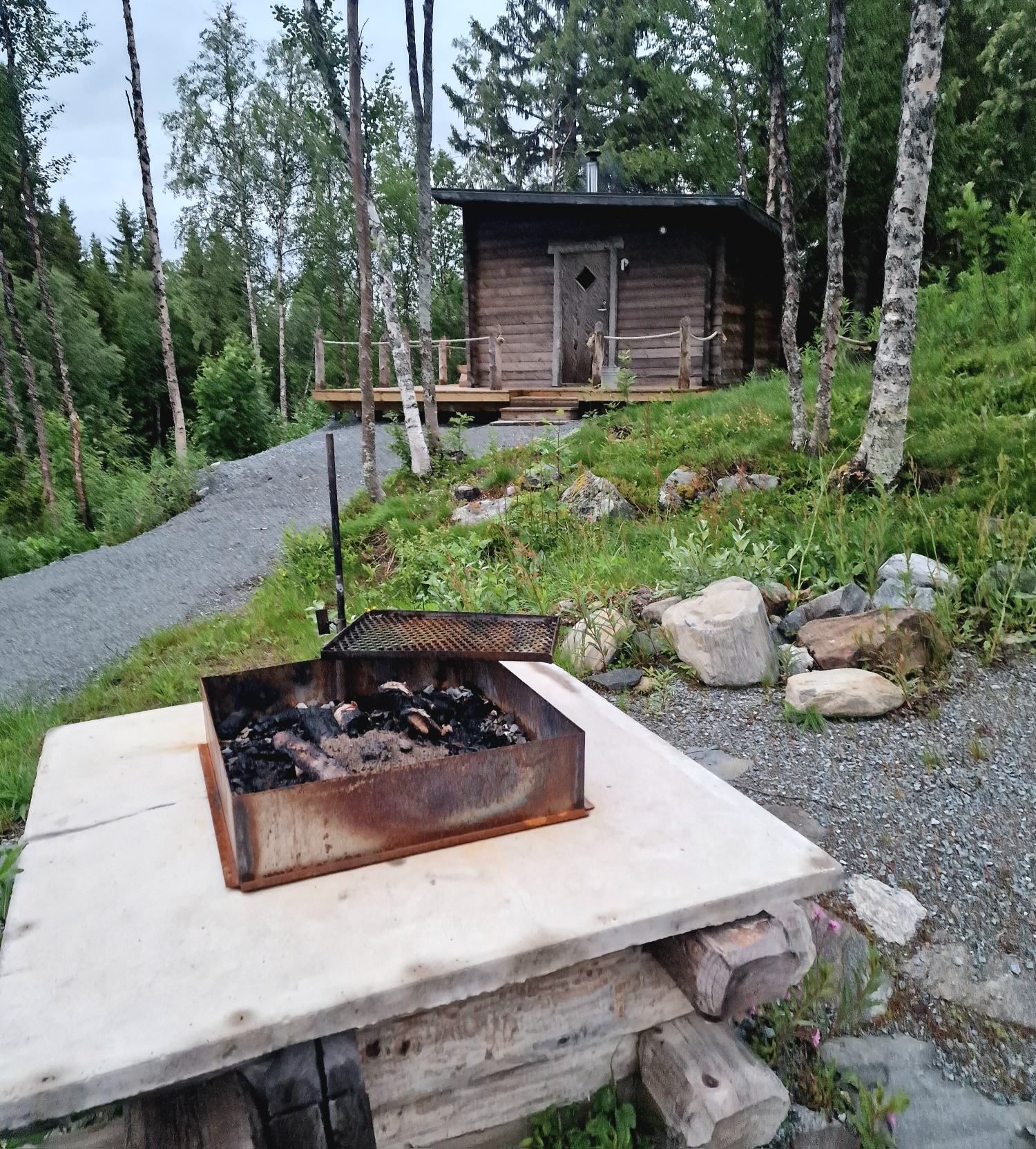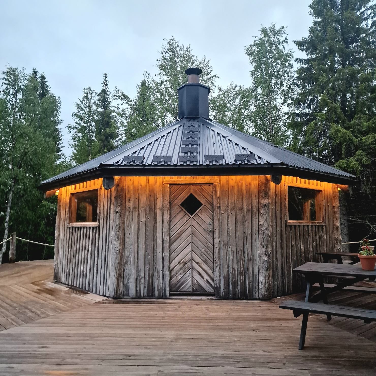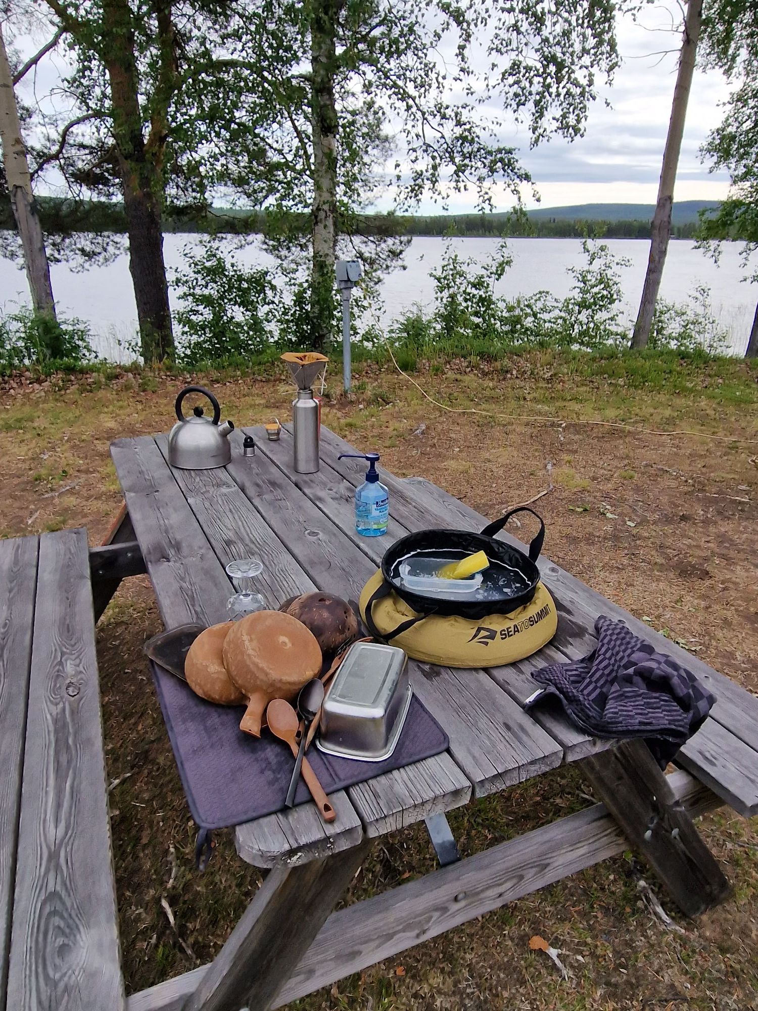 Op de foto’s leek de camping charmanter dan dat ie in het echt is. Er staan vaste afdakjes met caravans die er het hele jaar staan. Tussenin een paar rijen plek voor losse kampeerders. Onze eerste reactie is omkeren en ergens anders gaan staan. Maar een snelle opzoeking op de kaart toont dat de volgende camping nog best een eind rijden is. Het regent nog steeds hard, we hebben een ‘machine’ was bij dat nog moet drogen, dus deze camping met faciliteiten is dan wel handiger dan een drassige plek in the middle of nowhere. We blijven. We installeren ons vooraan, en zoals de meeste plekken hier hebben we een houten vlonder naast de deur als terras. Helaas is het geen buitenzitweer. Behalve dat ik zo’n staanplaatsen niet erg mooi vind, is er verder weinig op de camping aan te merken. De voorzieningen zijn super. Er is een keukengebouw, toiletten, douches, wasmachine en droger, sauna, stookhut, …. en zit allemaal in de prijs in van omgerekend zo’n 28 euro. En misschien nog wel het belangrijkste…. we zien hier (nog?) geen muggen!