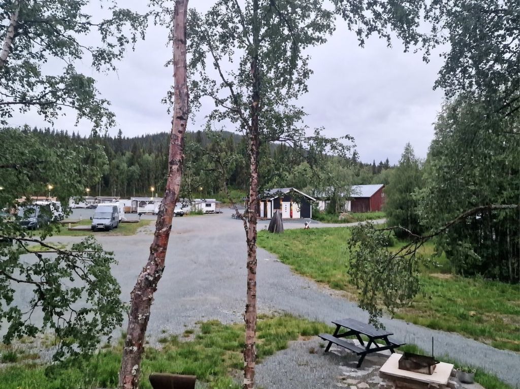 We dienen de camping uiterlijk om 12 uur te verlaten maar we zijn ruim op tijd. We zetten de navigatie richting Vilhelmina en op het moment dat we vertrekken, begint het te druppelen.