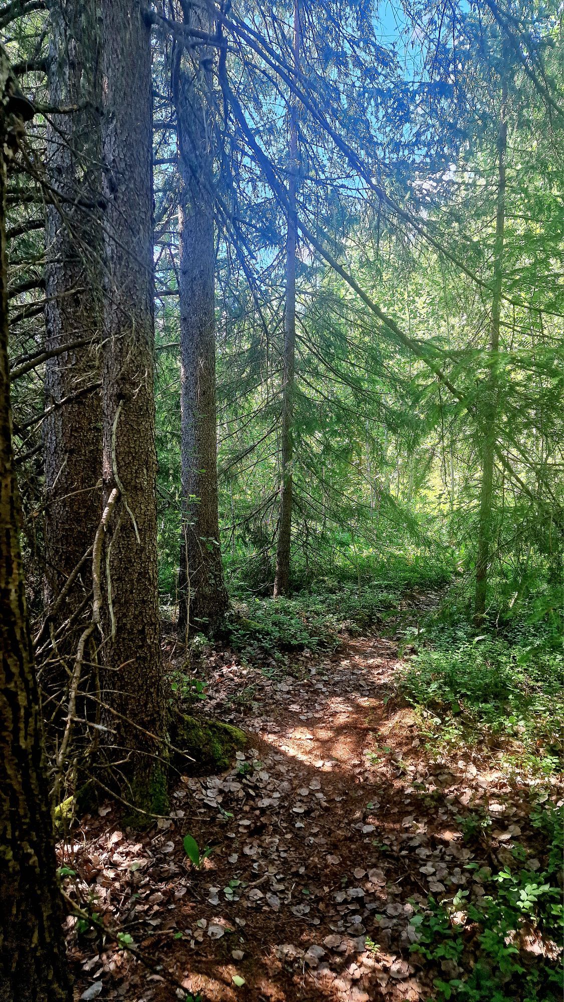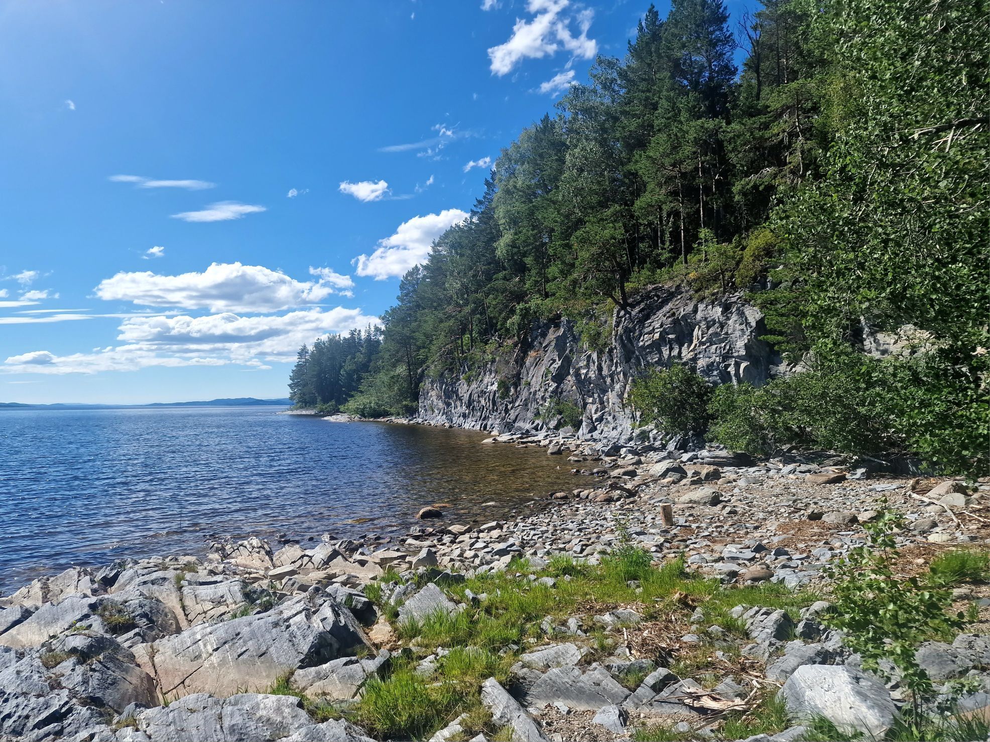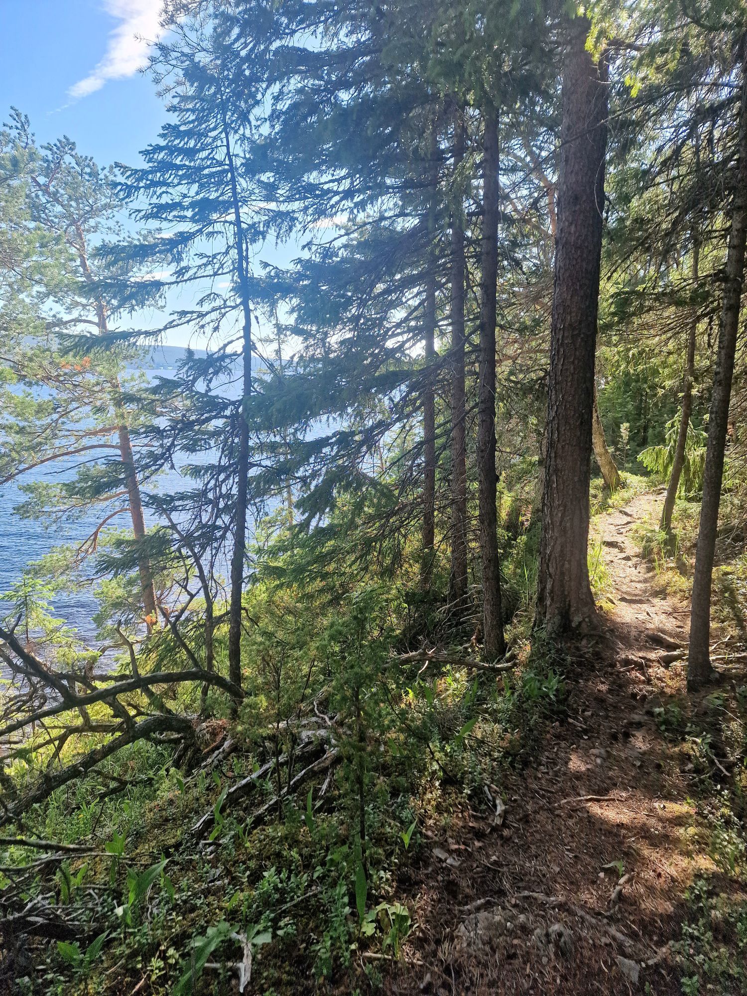 Voor ons hebben we uitzicht over het meer, en vanaf onze plek wandel je zo een strook bos in. Het is op zich geen moeilijke route, maar toch is het uitkijken. Op de meeste stukken is het een smal pad vol boomwortels en stenen, soms moet je onder of over gevallen boomstammen, of een stukje klimmen. Gelukkig had ik mijn nieuwe stok bij. Onderweg passeren we een paar kleine strandjes. Na ongeveer een uur hebben we het eindpunt bereikt. Het is de moeite. Het waait hier flink maar dat is nu welkom.