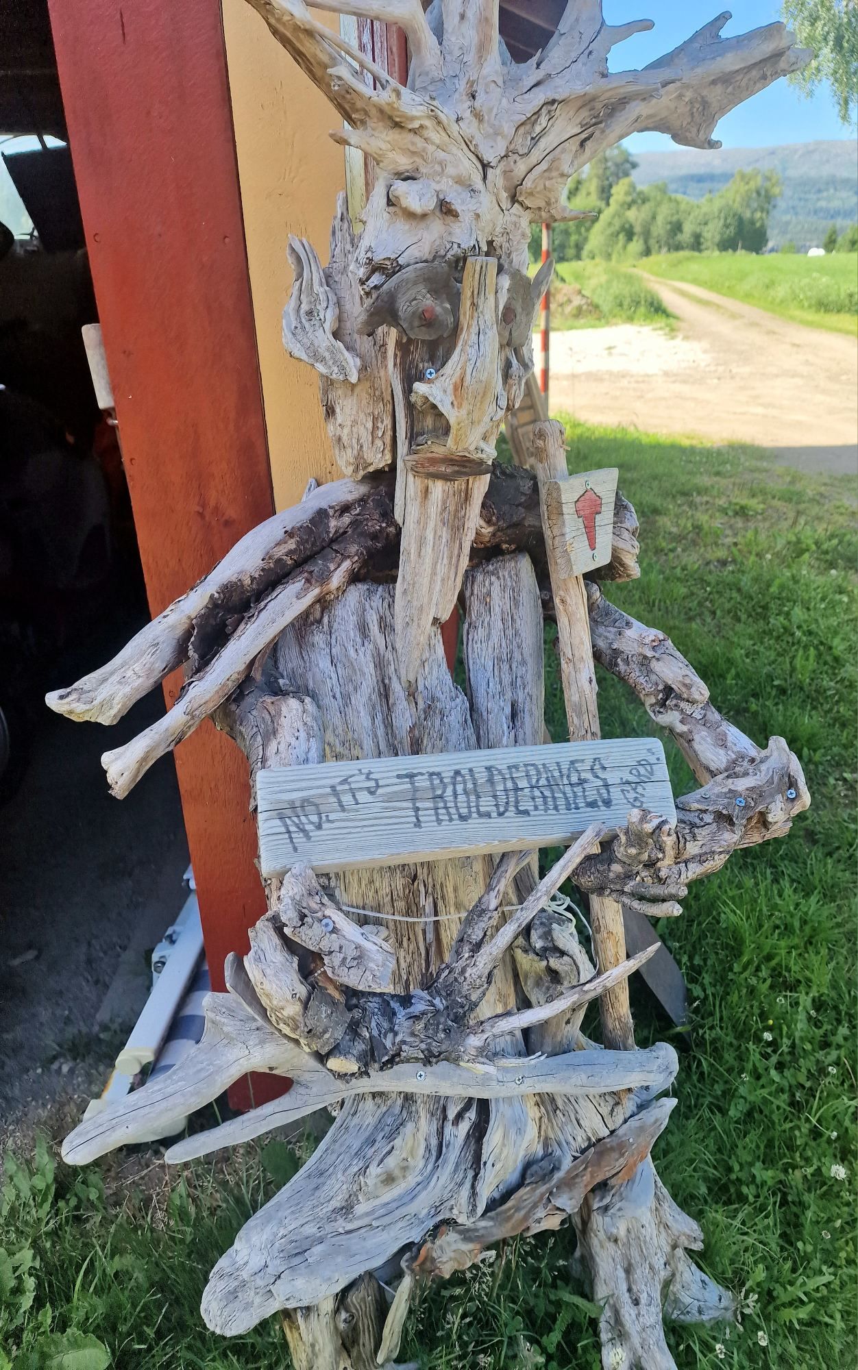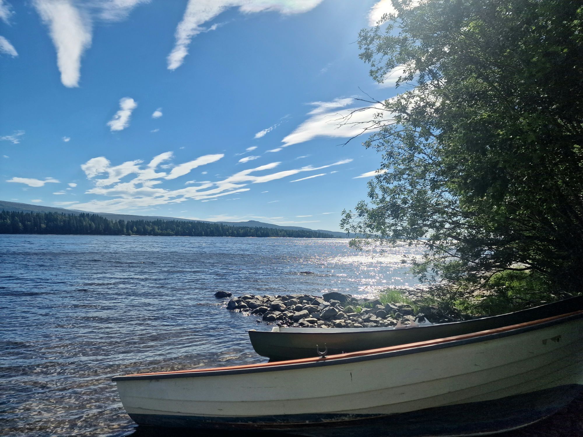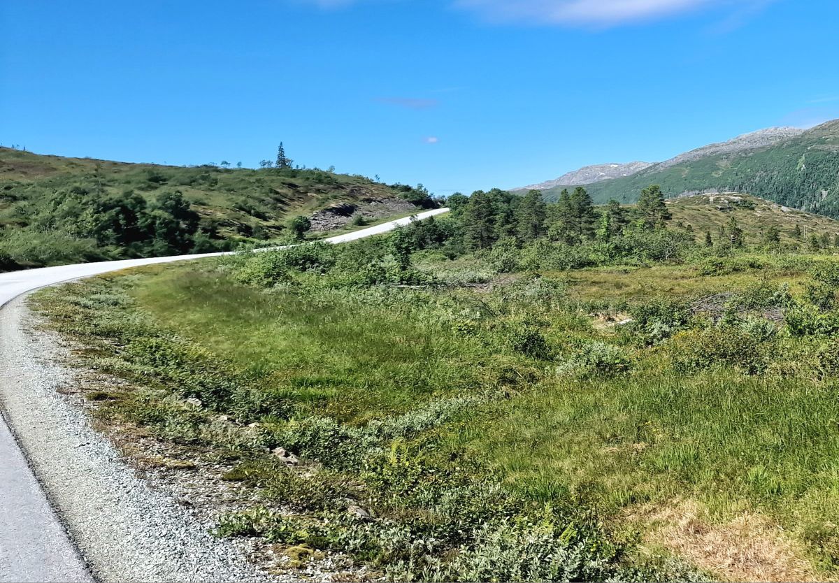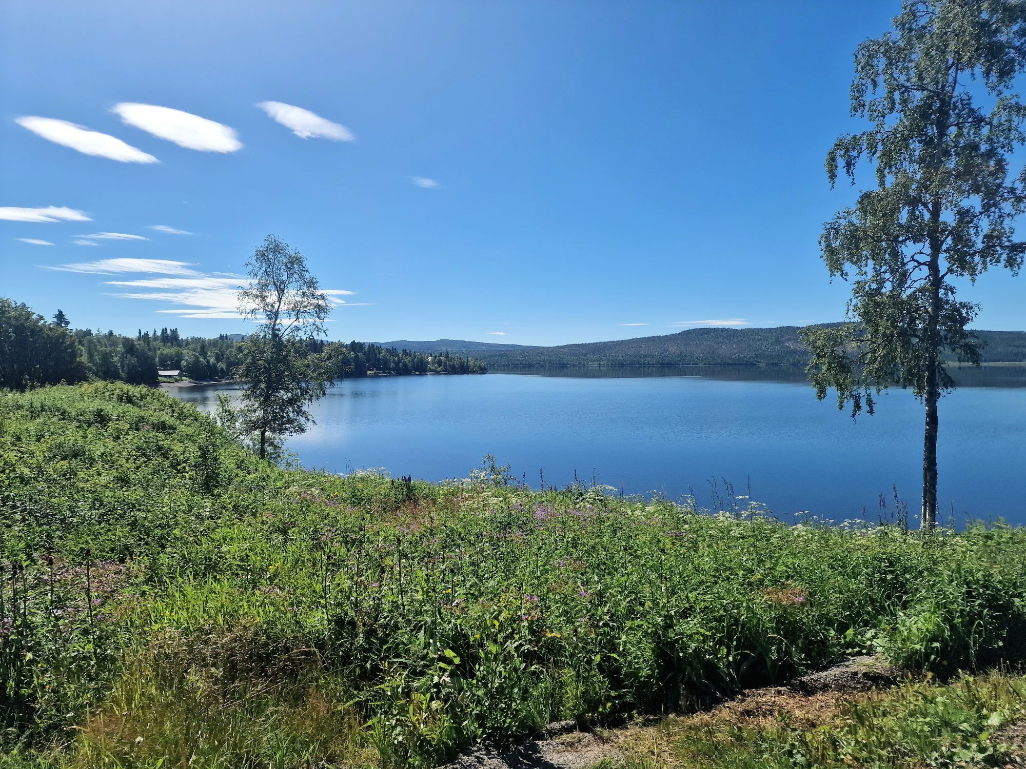 ‘Zullen we anders hier blijven staan?’ Vraagt Luc, die het intussen wel helemaal gehad heeft met die beestjes. Ik snap het ook wel, hij heeft dan ook veel meer muggenbulten dan ik. Het is ook helemaal geen verkeerde plek hier voor een overnachting maar om nu de hele dag op deze parking te blijven, zie ik ook weer niet zitten. Daarbij, gisterenavond hebben we beslist om naar een camping in Snåsa te rijden, dus dat gaan we doen ook. Het is een hele mooie weg en helemaal niet druk. We genieten van de omgeving, en stoppen soms even. Het zijn niet zo heel veel kilometers die we vandaag moeten doen, maar we doen er wel lang over. De weg kronkelt langs rotsen, langs meren, langs watervalletjes, langs mooie recente huizen maar ook langs oude verlaten houten hutjes. Het lijkt soms net alsof we door een postkaart rijden. Enkele sfeerbeelden van onderweg naar de camping: