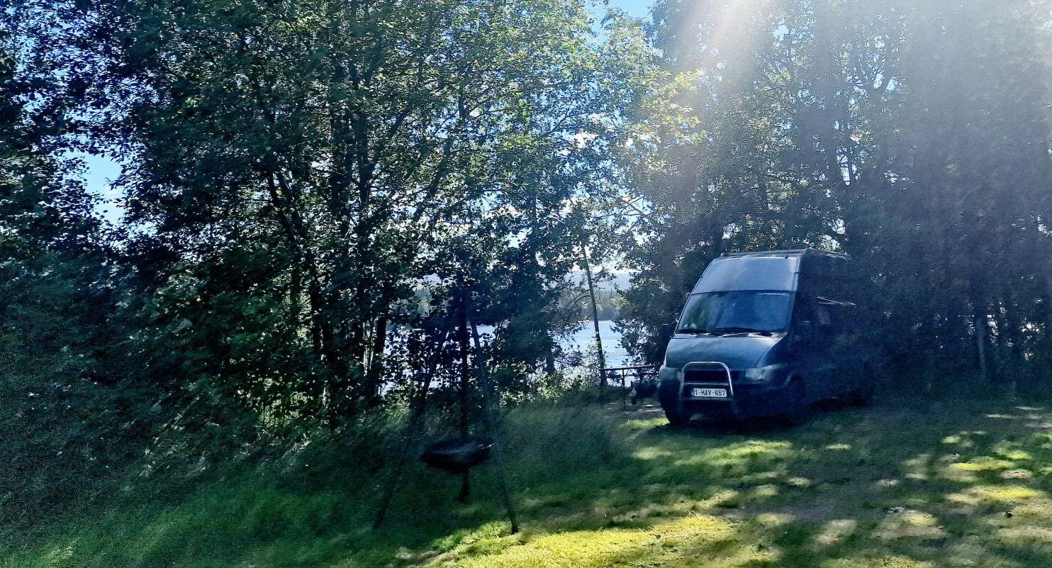 Het wordt al vroeg warm in de bus. Ik sla het dekbed weg en schuif het gordijn opzij. De zon! En niet zo’n beetje. Ik baal er al wat van dat we ons verslapen hebben maar zie dan op m’n gsm dat het nog maar 7 uur is. Ik draai me nog heel even om maar slapen lukt niet meer. Voorzichtig stap ik naar buiten en blijf even afwachtend staan. Niks. Geen muggen, geen knutjes, gewoon niks. Zalig. We drinken onze koffie buiten, zonder hysterische bewegingen.