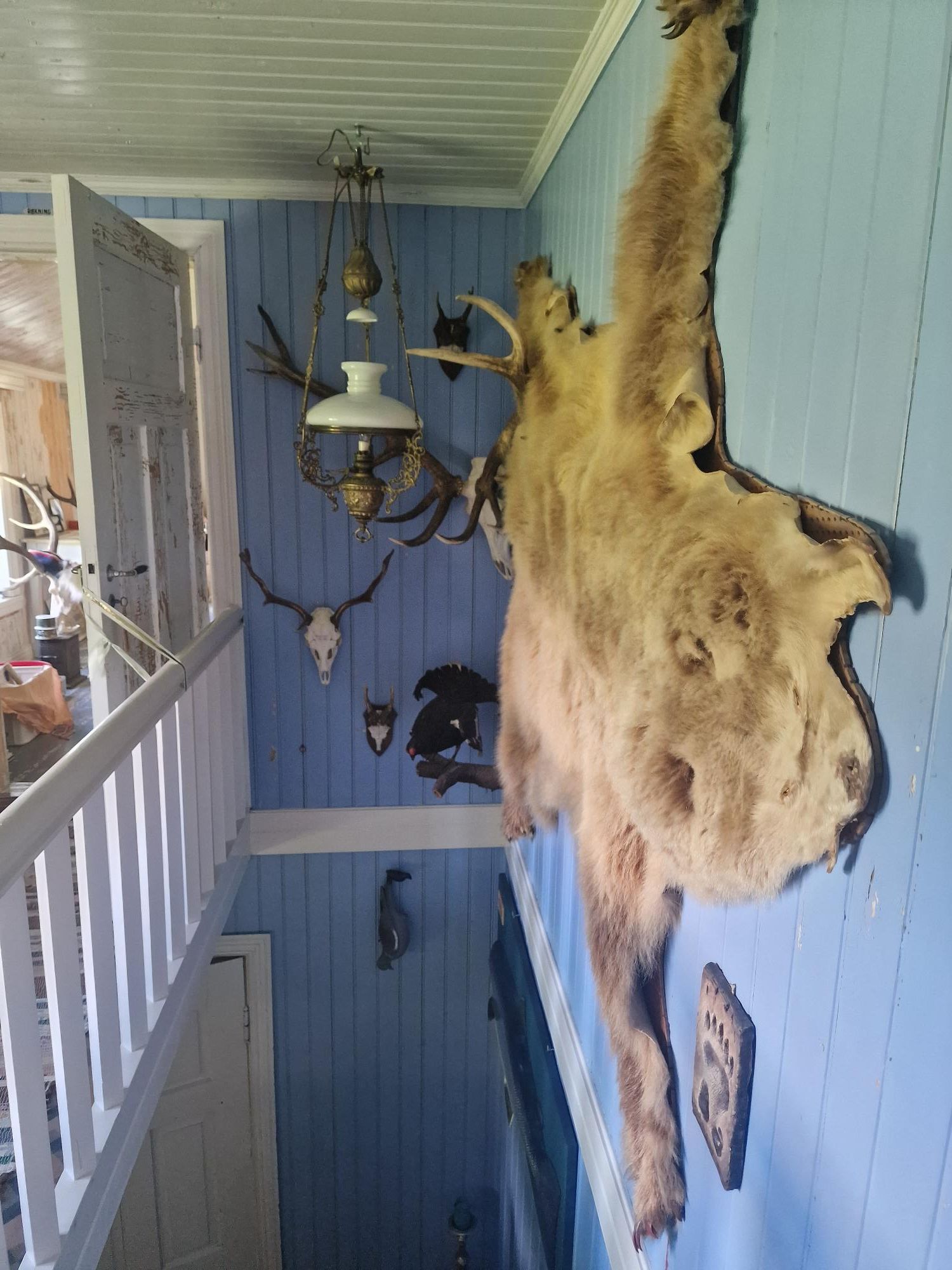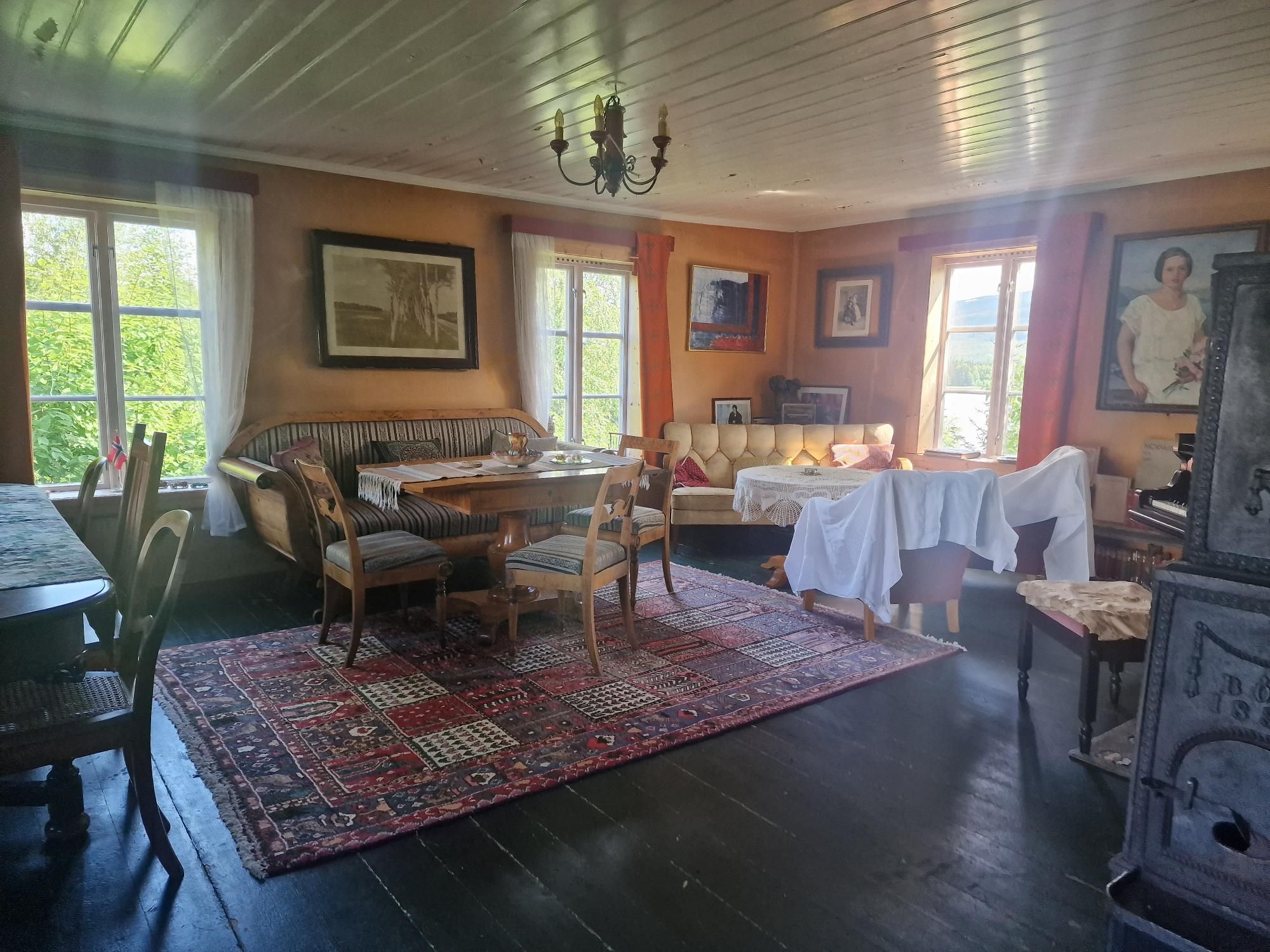 Naast het kampeerterrein staat een geel houten huis. Een museum. Nu zijn wij totaal geen museummensen. Helaas. Ik wou dat het anders was, maar 9 van de 10 keren is een museumbezoek door ons ‘het zo snel mogelijk volgen van de exit-pijlen’. Maar hier zijn we toch wel nieuwsgierig naar. Het zou het huis zijn wat ooit als vakantiewoning gekocht is door een rijke Duiste industrieel. En om als hostel te dienen voor de mensen op het stoomschip dat hier vroeger aanmeerde. Ook het hele stuk grond met 10 kilometer kustlijn was van hem. Zijn bijnaam: Bear Hunter. Ik ga niet de hele geschiedenis hier typen, op wikipedia is dat wel op te zoeken. Enfin, het huis staat er nu dus nog steeds, en is zoveel mogelijk intact gelaten met de spullen van hem en zijn gezin. Uiteraard zijn er ook dingen bijgevoegd. En uitleg bij enkele zaken. Het huis is alle dagen gewoon open en toegankelijk. Tenzij het verhuurd is, wat soms gebeurt, maar vandaag is het open.