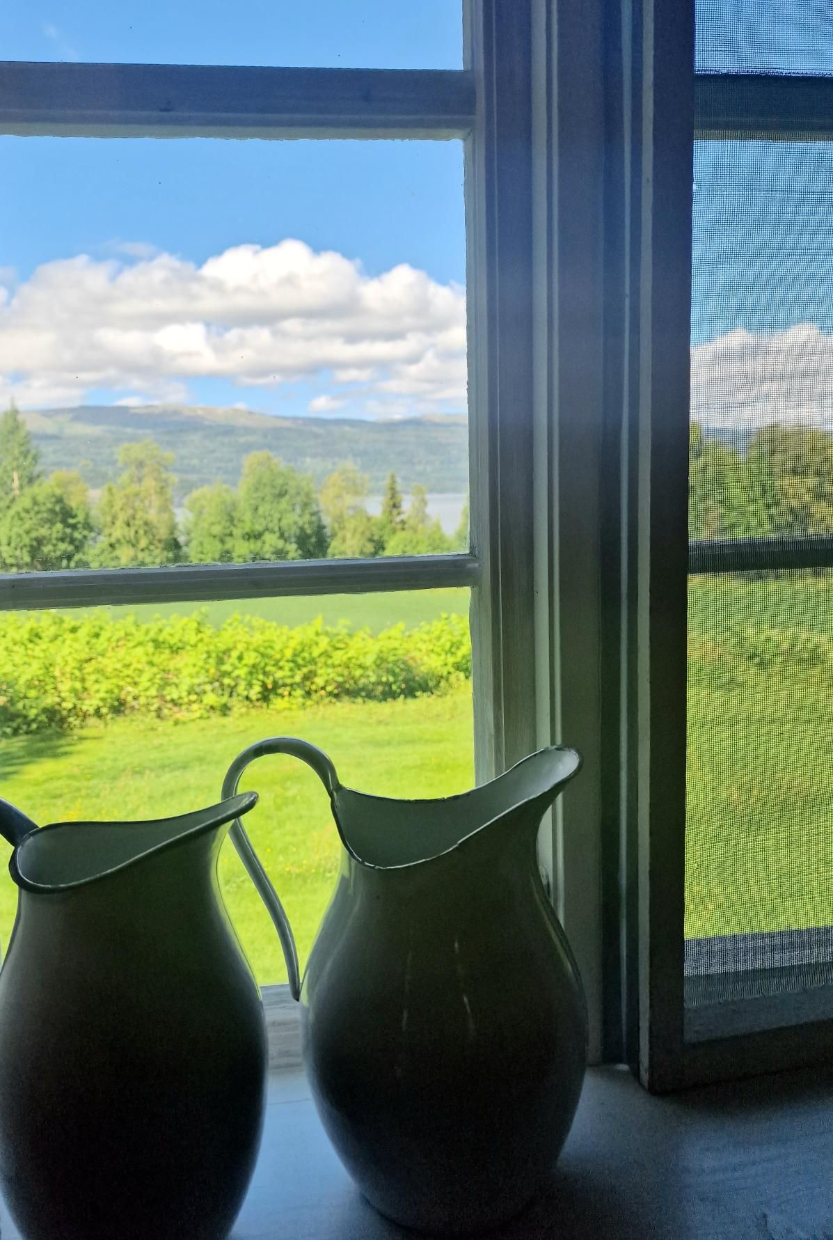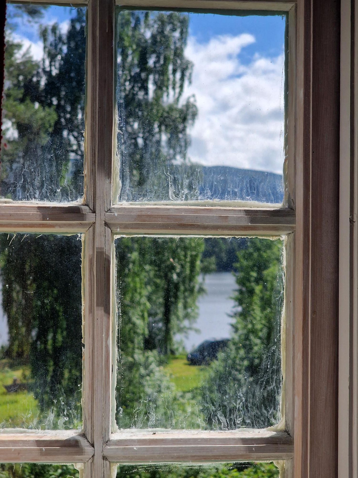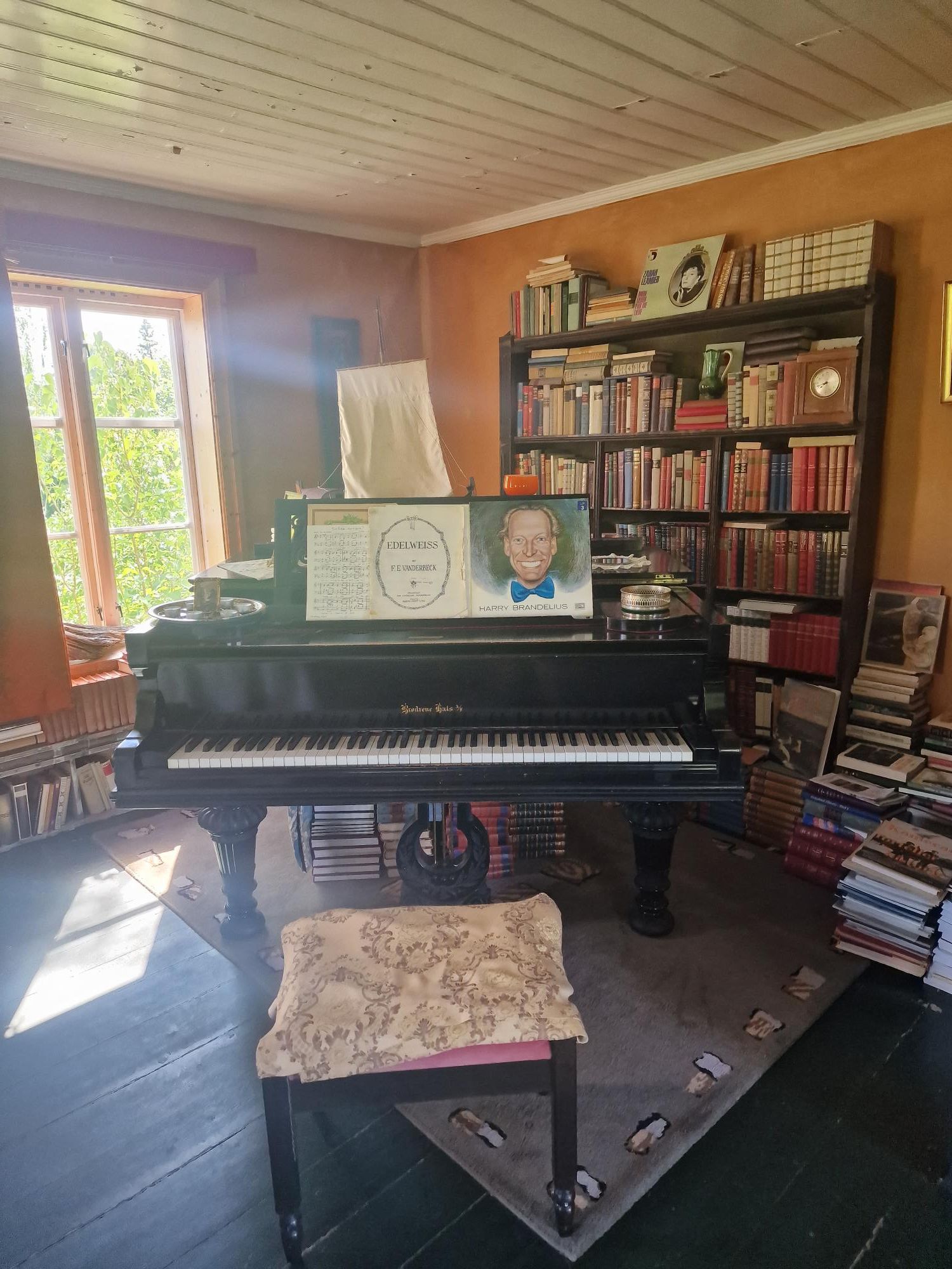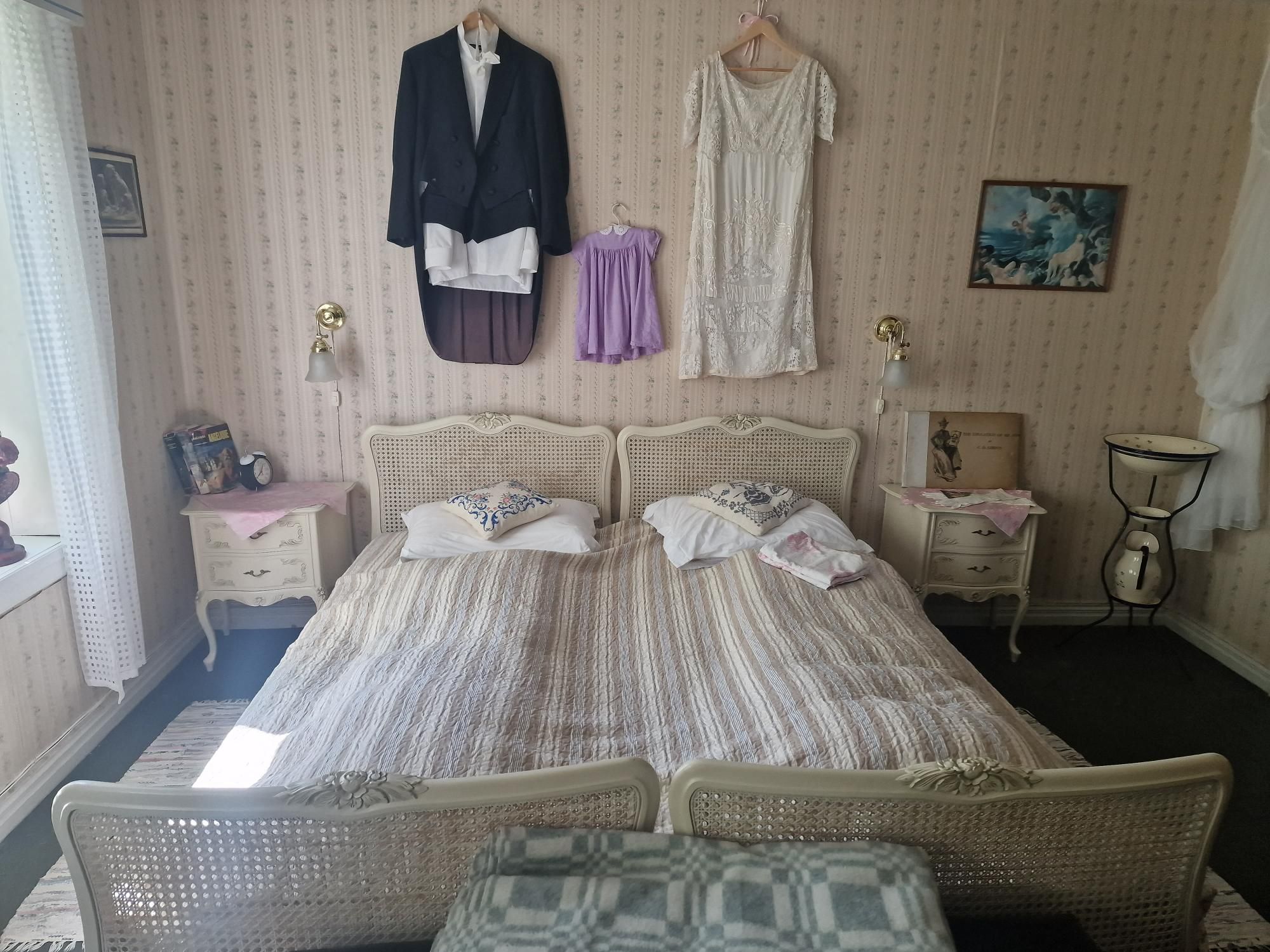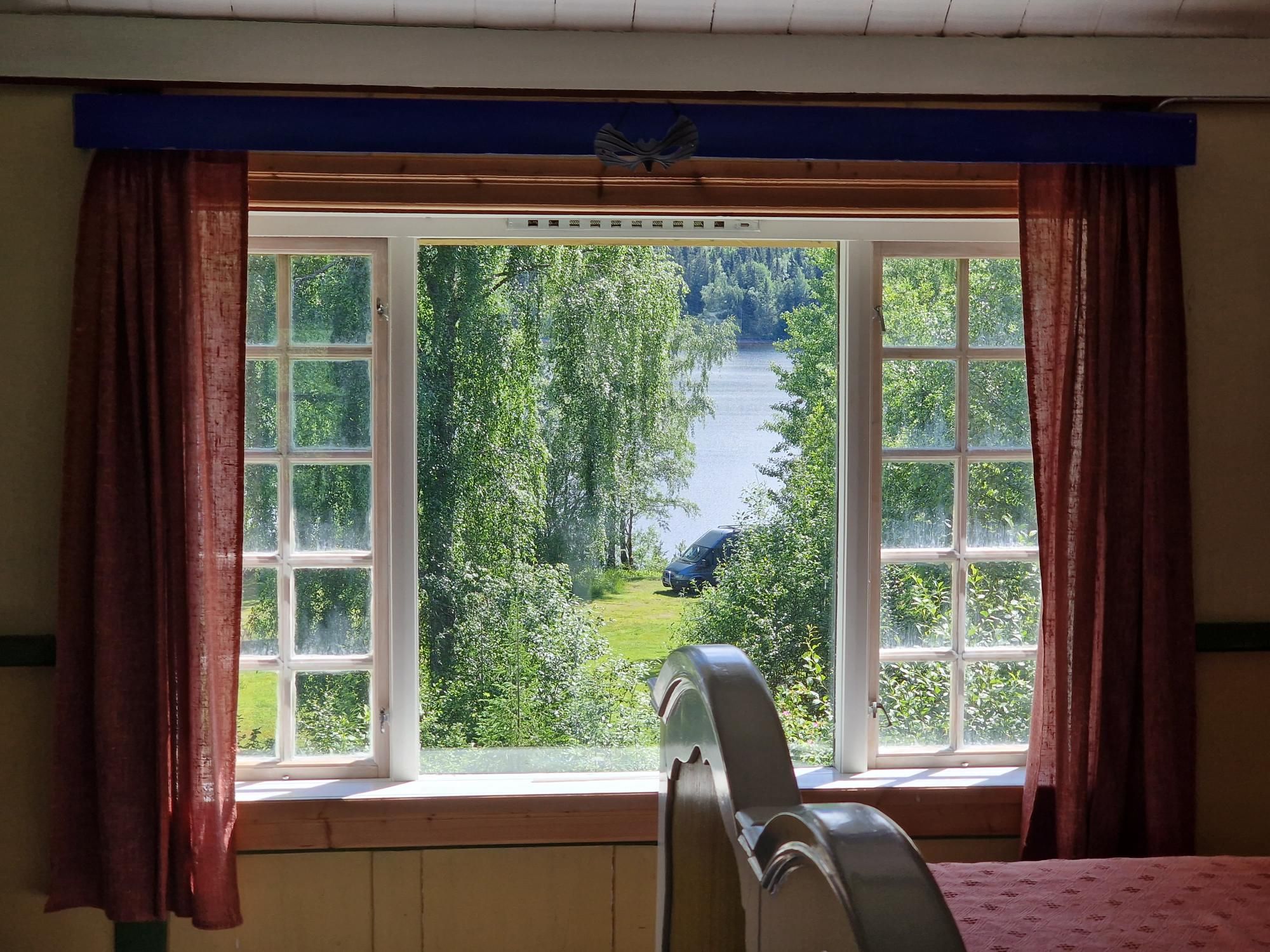 Wauw, alsof je echt een huis binnenstapt van iemand die nog terugkomt. Toch als je enkele spullen weg zou denken. Hier moet een rijke familie gewoond hebben. Nuja, gewoond….tijdens vakanties dan. De woonkamer met piano, de slaapkamers, de hal, de keuken en eetplaats lijken allemaal hun eigen verhaal te vertellen. Je kunt je zo voorstellen hoe er geleefd werd. Het vel van de beer die hij geschoten heeft passeer je als je de trap opgaat. Oude foto’s, kleding, kleine accessoires, opgezette dieren en wat kunstwerken….. het geeft een klein stukje inkijk in iemands leven. Van een leven van al lang geleden. Het ruikt zelfs zo. Vanuit het slaapkamerraam heb je een mooi uitzicht op de campingplaatsen. Van hieruit maak ik ook een paar foto’s van ons busje. Onwaarschijnlijk dat dit huis zo te bezoeken is terwijl er niemand anders is. Ik vermoed dat het bij ons al lang leeggeroofd en vernield zou zijn. Hoe interessant het ook is om alle kamers zo te bezichtigen, het huren als vakantiehuis zou ik niet willen. Van z’n leven niet dat ik in dat huis zou slapen. Brrrr.