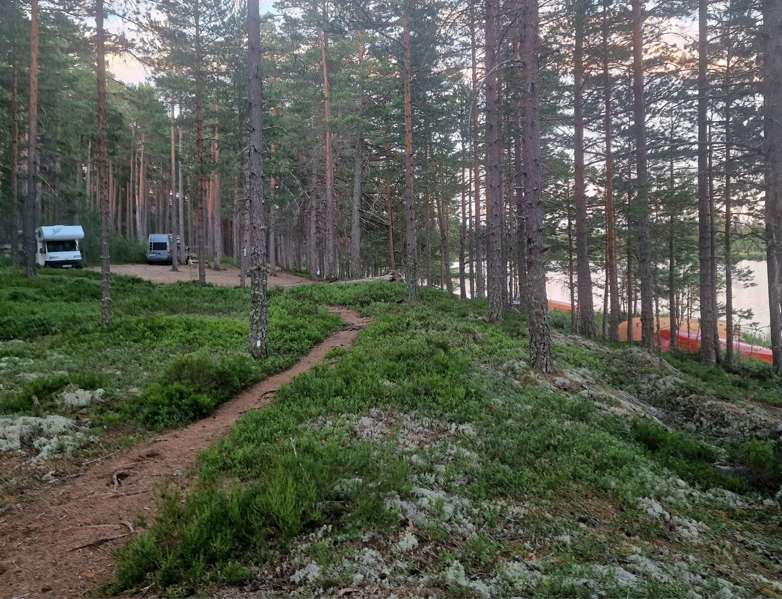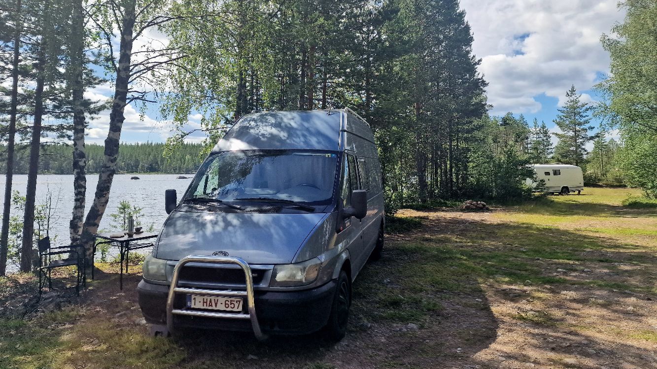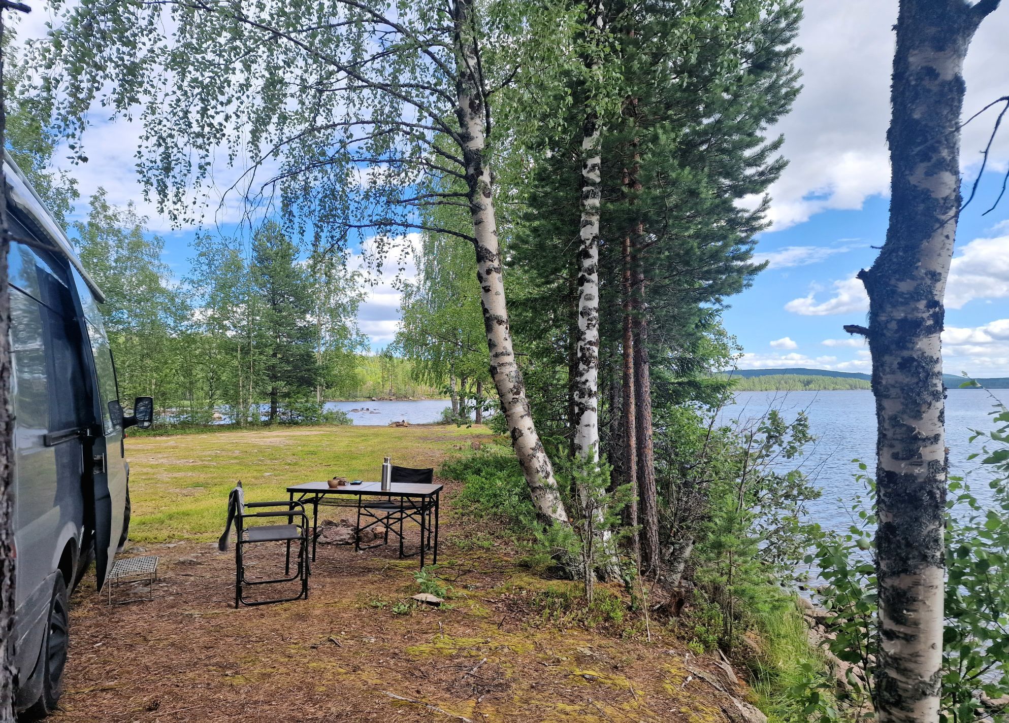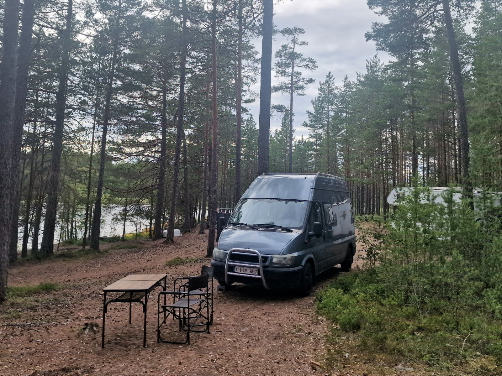 We hebben geluk. Een bospad leidt ons naar een meer. Er is een stookplaats en volgens de app kunnen hier 4 campers staan. Er parkeert tegelijk met ons een auto. Het is een visser die hier in z’n bootje komt hengelen. We zijn nog niet geïnstalleerd of er komt nog een camper bij staan. Plaats genoeg. We blijven hier. Dit is zoveel beter dan die camping van daarnet. En nog gratis ook. We wandelen wat rond. Het is vooral naaldbos met hier en daar wandelpaadjes. Sommige stukken bodem bedekt met rendiermos. Een eindje verderop zien we nog een mooi stuk ‘strand’, precies zoals de Zweedse visser vertelde. Ook met stookplek en met een schuilhok. En geschikt om te zwemmen. Dat laatste doen we nog maar even niet. We twijfelen of we de bus nog zullen verhuizen maar we blijven toch maar staan. We hebben ‘m al rechtgezet op de blokken en de tafel al buiten staan. Daarbij staan we vlakbij de stookplek en hebben we onderweg een zak houtblokken gekocht. Het is nu nog te winderig maar wie weet, vanavond misschien.