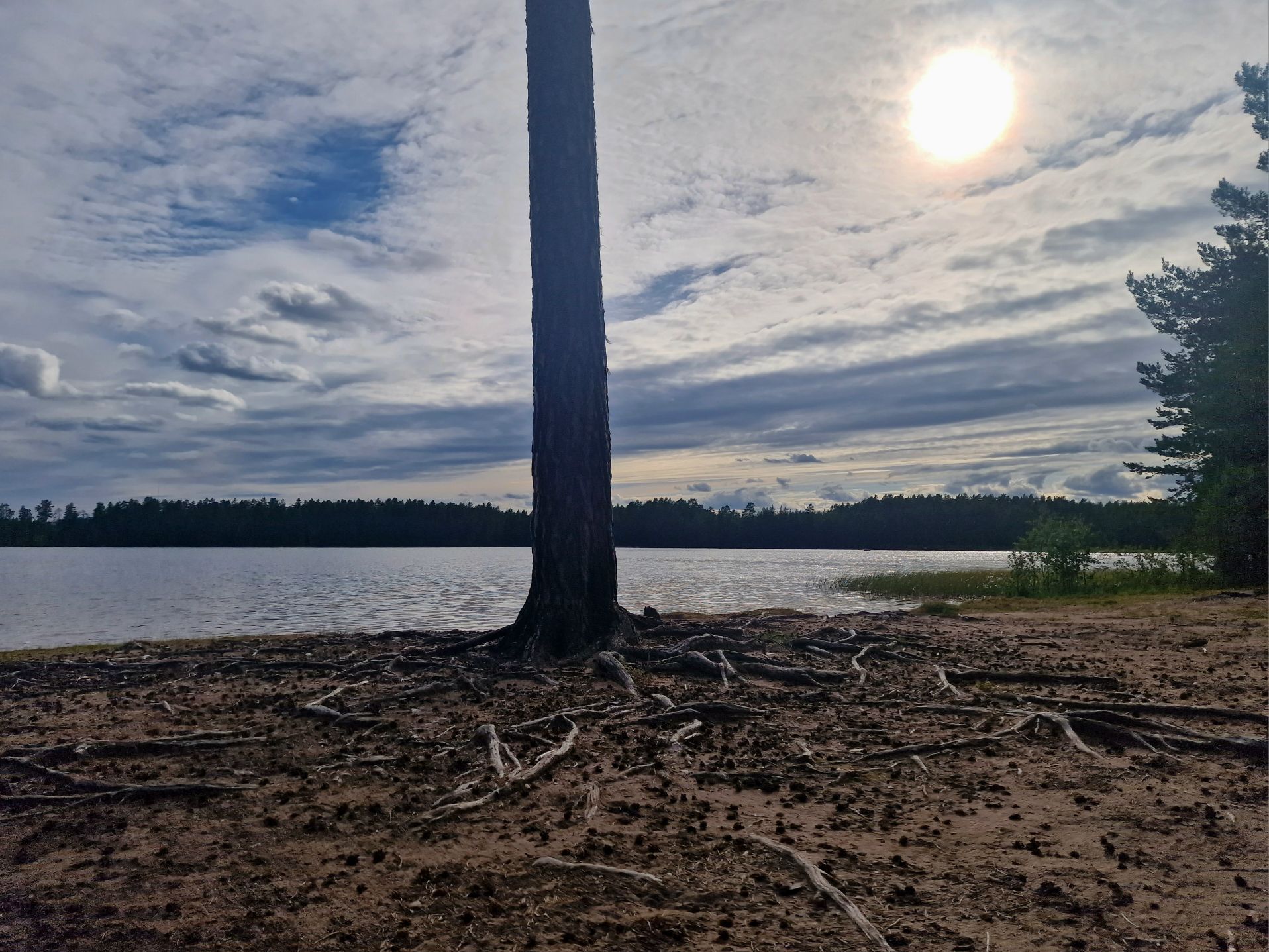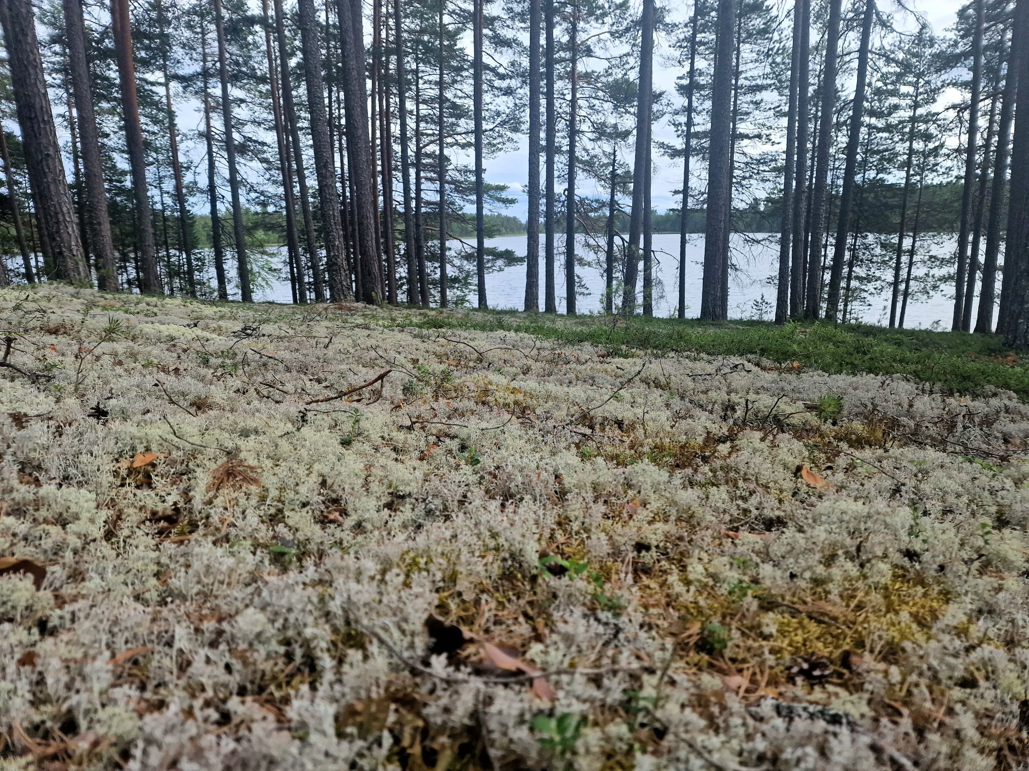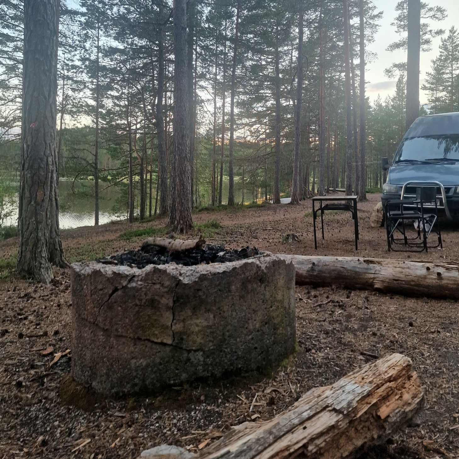 We hebben geluk. Een bospad leidt ons naar een meer. Er is een stookplaats en volgens de app kunnen hier 4 campers staan. Er parkeert tegelijk met ons een auto. Het is een visser die hier in z’n bootje komt hengelen. We zijn nog niet geïnstalleerd of er komt nog een camper bij staan. Plaats genoeg. We blijven hier. Dit is zoveel beter dan die camping van daarnet. En nog gratis ook. We wandelen wat rond. Het is vooral naaldbos met hier en daar wandelpaadjes. Sommige stukken bodem bedekt met rendiermos. Een eindje verderop zien we nog een mooi stuk ‘strand’, precies zoals de Zweedse visser vertelde. Ook met stookplek en met een schuilhok. En geschikt om te zwemmen. Dat laatste doen we nog maar even niet. We twijfelen of we de bus nog zullen verhuizen maar we blijven toch maar staan. We hebben ‘m al rechtgezet op de blokken en de tafel al buiten staan. Daarbij staan we vlakbij de stookplek en hebben we onderweg een zak houtblokken gekocht. Het is nu nog te winderig maar wie weet, vanavond misschien.