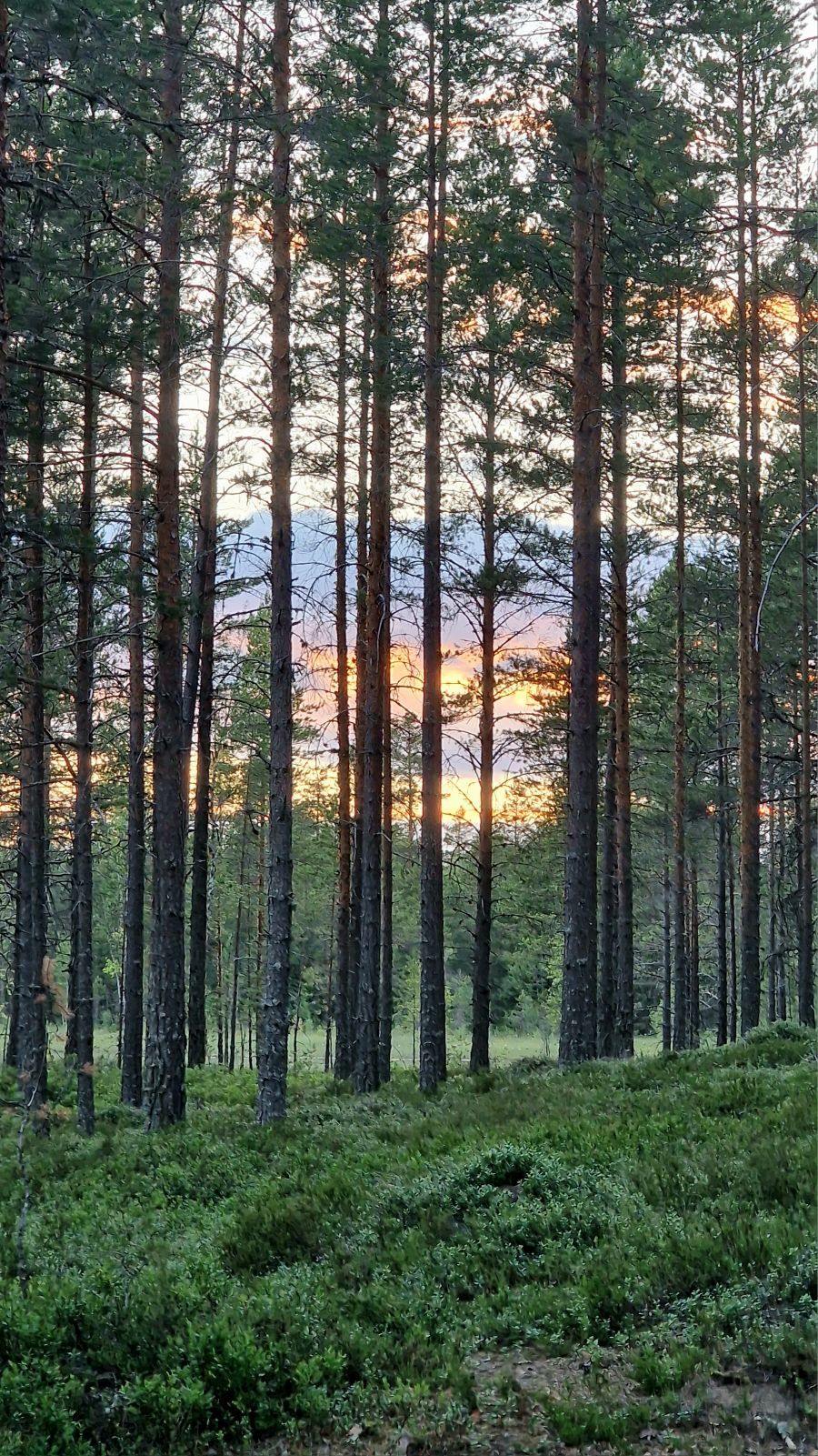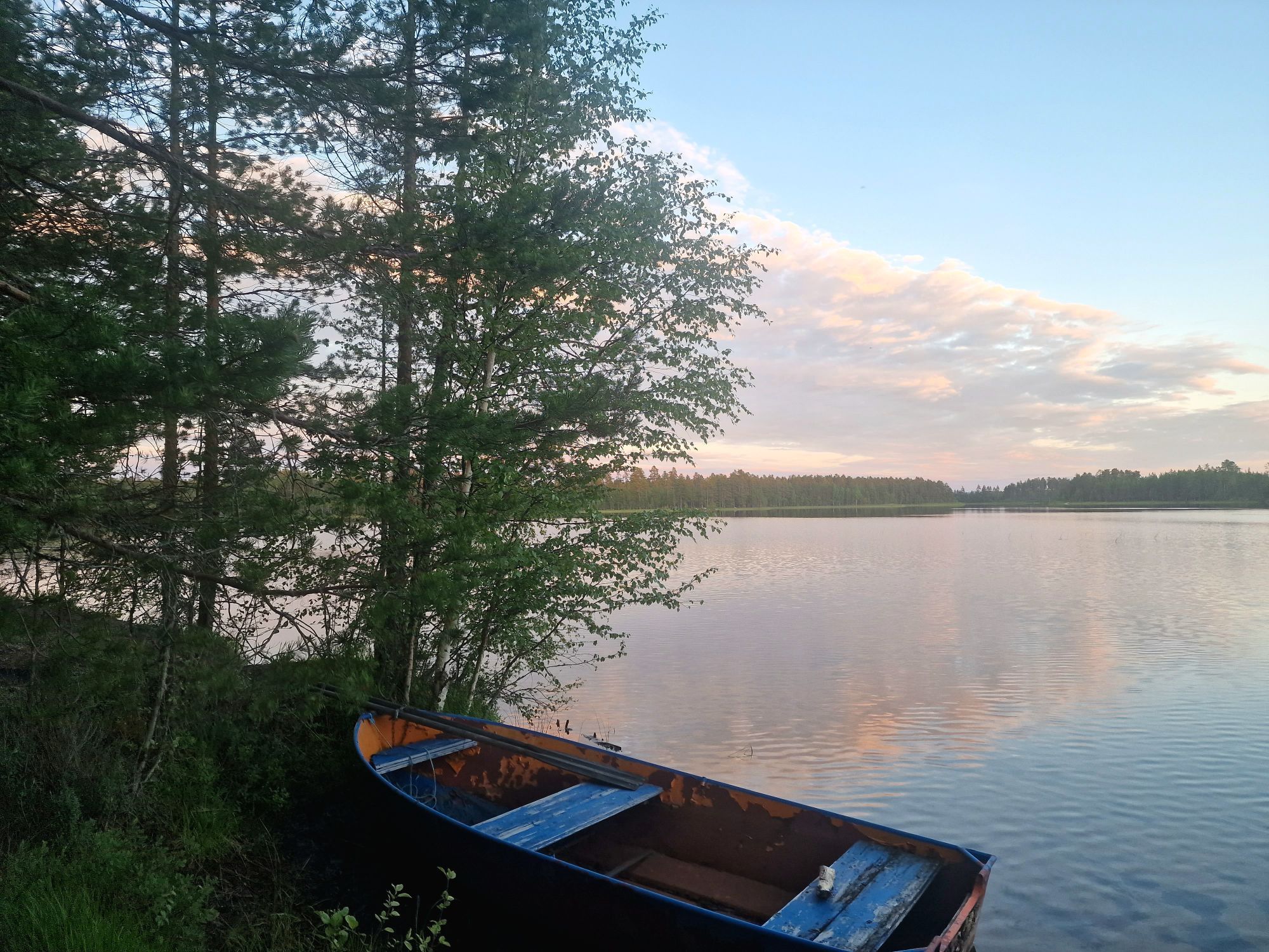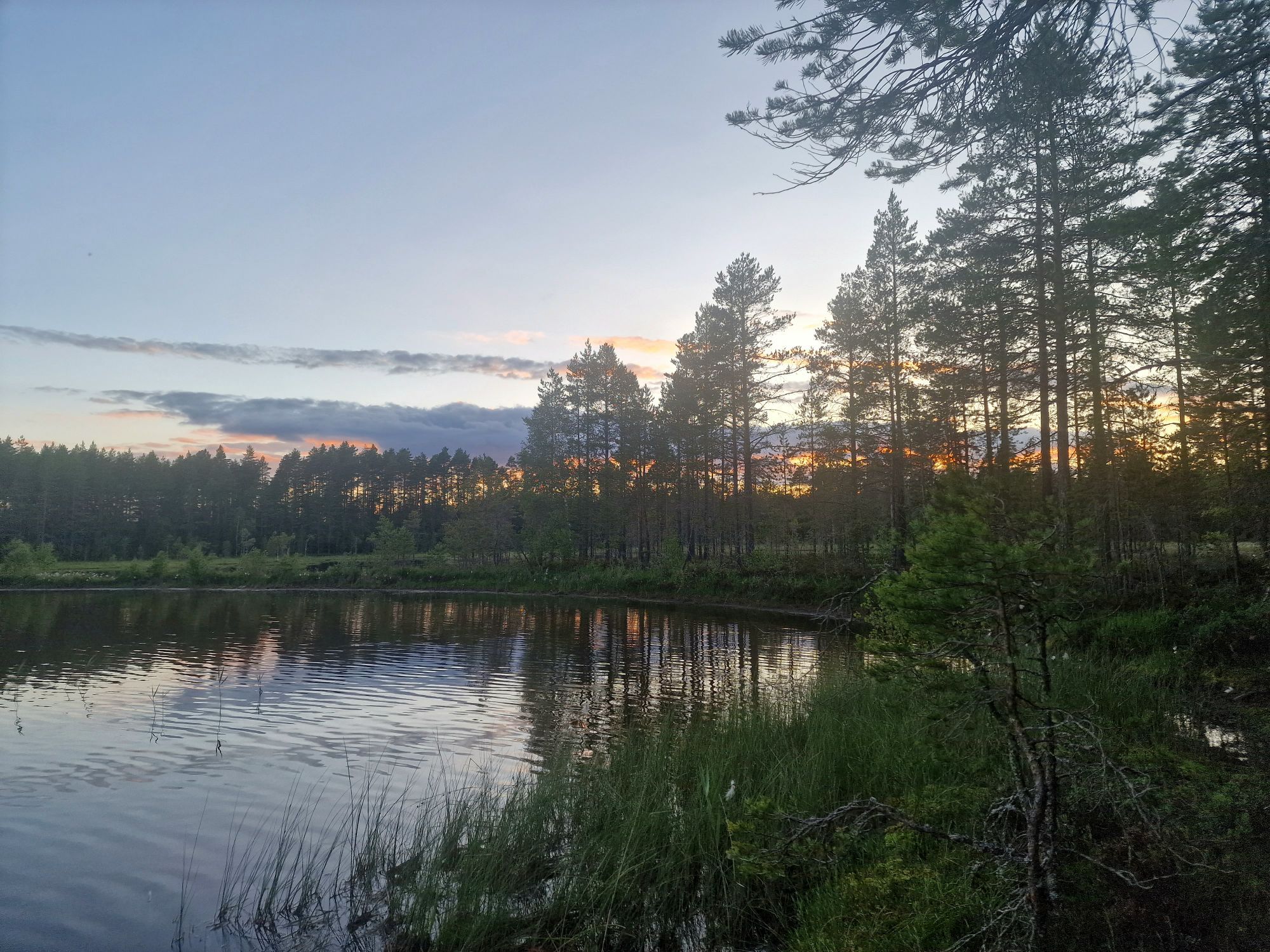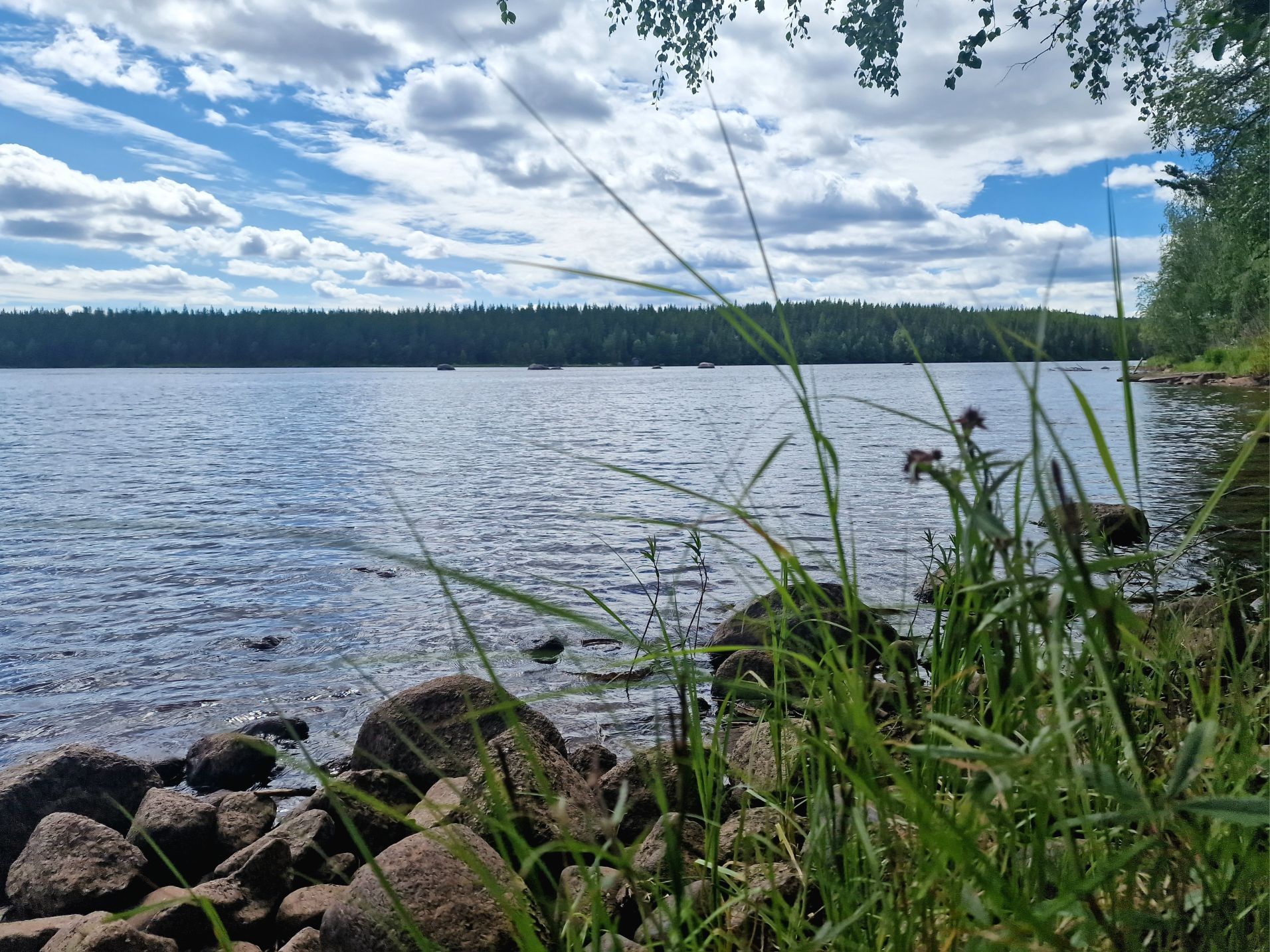 We hebben geluk. Een bospad leidt ons naar een meer. Er is een stookplaats en volgens de app kunnen hier 4 campers staan. Er parkeert tegelijk met ons een auto. Het is een visser die hier in z’n bootje komt hengelen. We zijn nog niet geïnstalleerd of er komt nog een camper bij staan. Plaats genoeg. We blijven hier. Dit is zoveel beter dan die camping van daarnet. En nog gratis ook. We wandelen wat rond. Het is vooral naaldbos met hier en daar wandelpaadjes. Sommige stukken bodem bedekt met rendiermos. Een eindje verderop zien we nog een mooi stuk ‘strand’, precies zoals de Zweedse visser vertelde. Ook met stookplek en met een schuilhok. En geschikt om te zwemmen. Dat laatste doen we nog maar even niet. We twijfelen of we de bus nog zullen verhuizen maar we blijven toch maar staan. We hebben ‘m al rechtgezet op de blokken en de tafel al buiten staan. Daarbij staan we vlakbij de stookplek en hebben we onderweg een zak houtblokken gekocht. Het is nu nog te winderig maar wie weet, vanavond misschien.