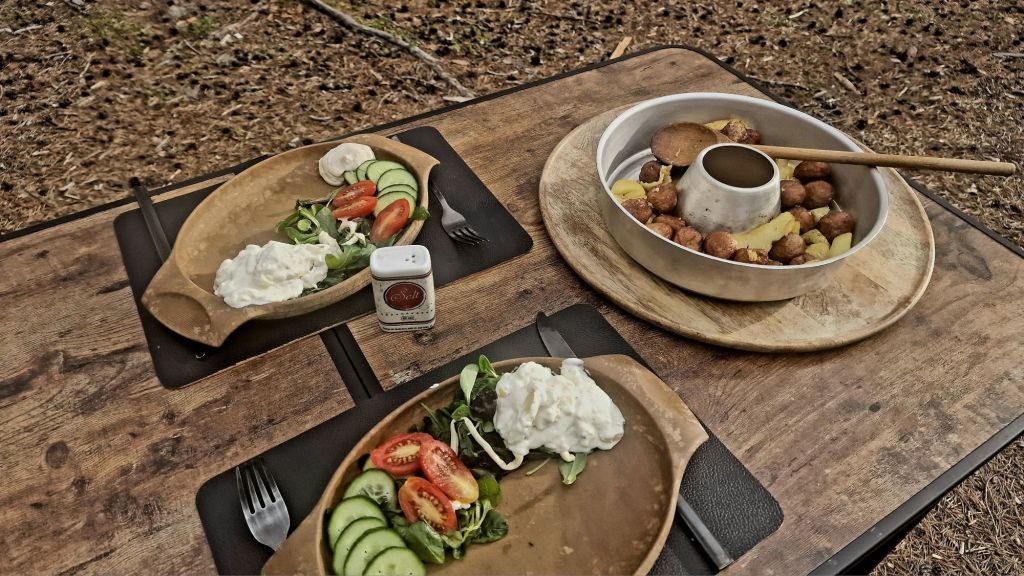 Ik zet de omniapan op het vuur en gooi er wat aardappelpartjes uit de diepvries en kant-en-klare Zweedse balletjes in. Ik zie wel of het iets wordt op deze manier. Zo niet, dan hebben we altijd nog knäckebröd. Maar hey, een half uur later zitten we dan aan ons tafeltje met uitzicht. En dat het smaakt!