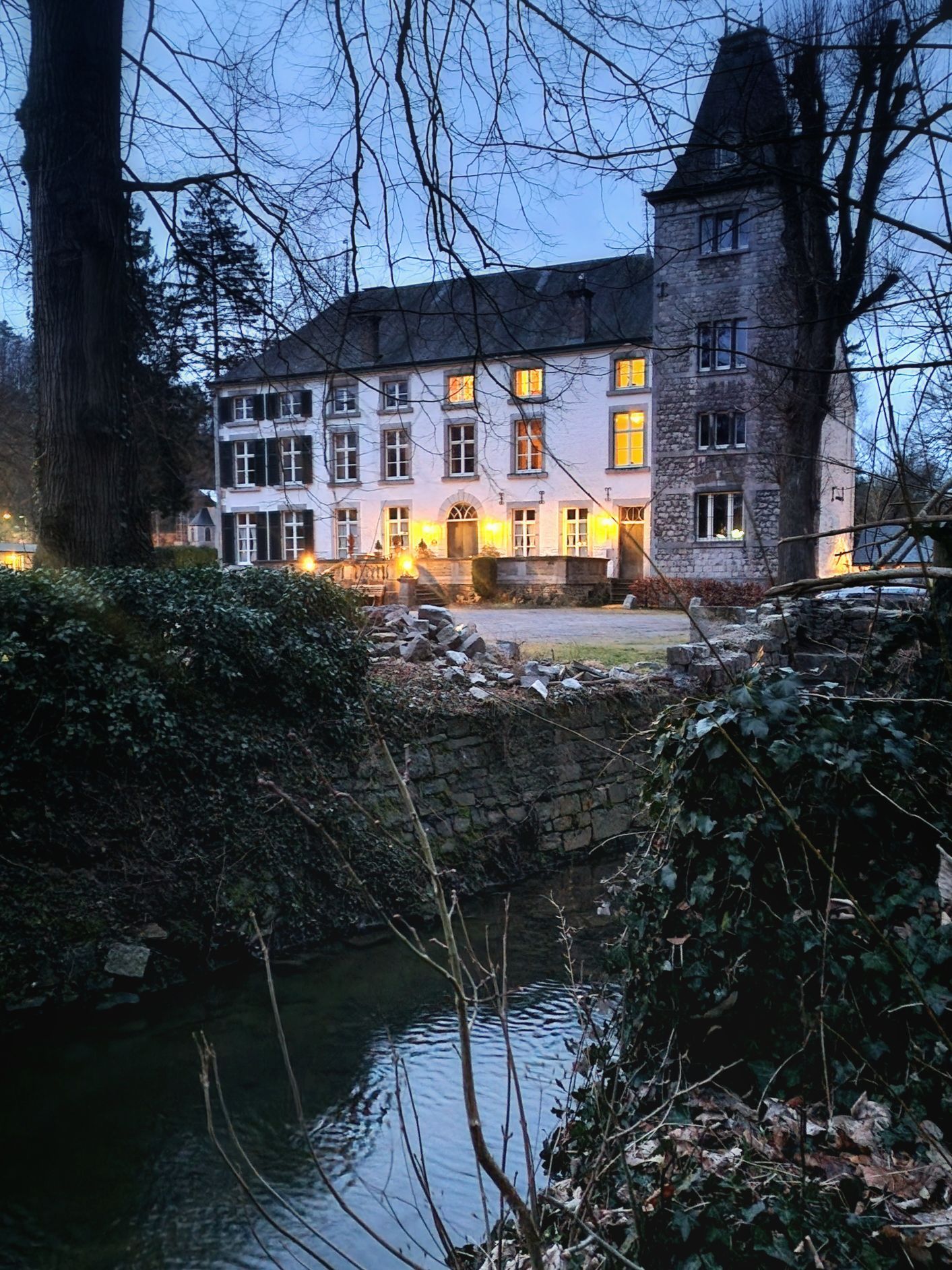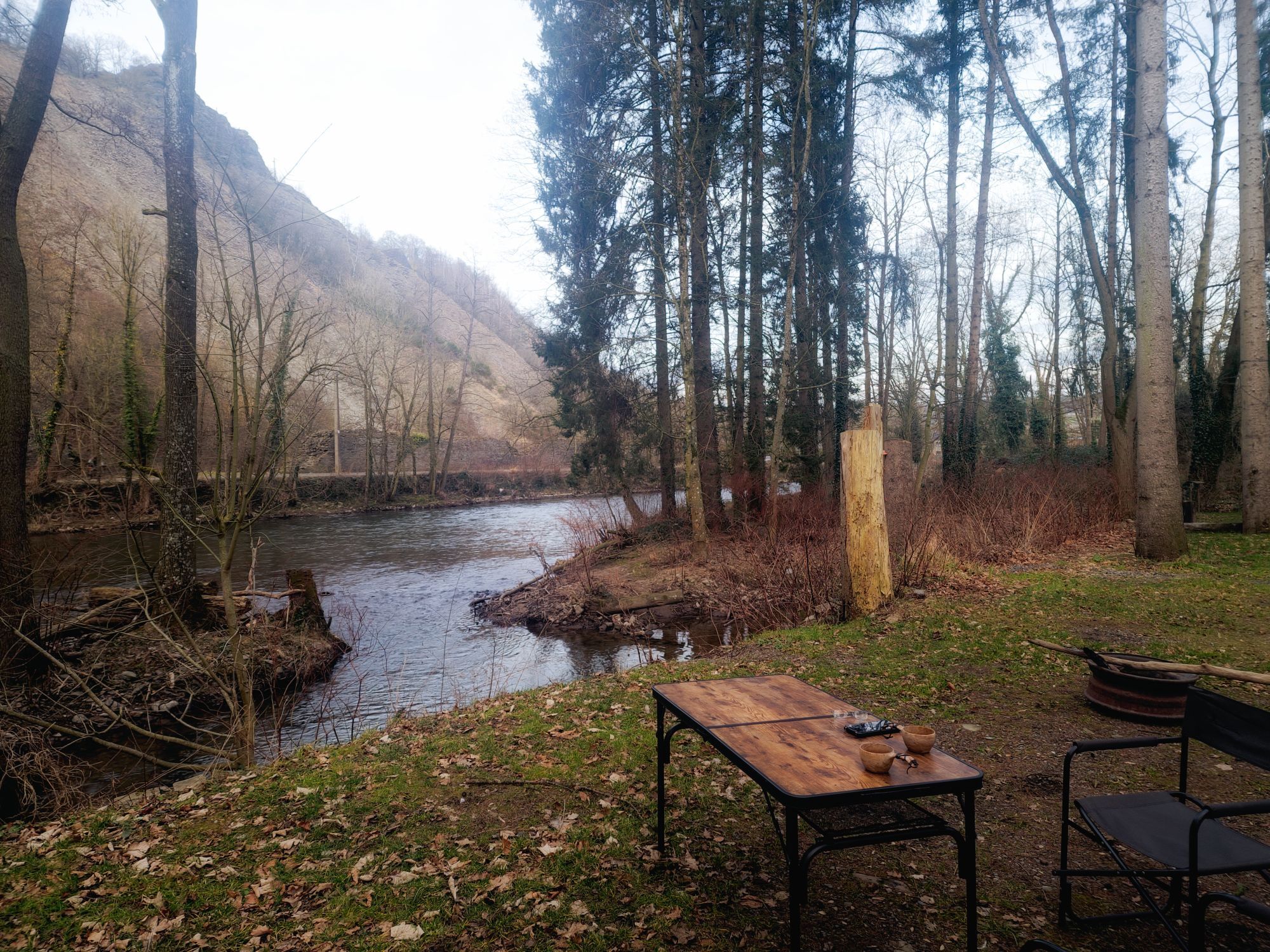 We settelen ons aan de rand van rivier de Ambleve. Aan de overkant de geitenberg. Hartstikke steil, en toch lopen de geiten daar gewoon te grazen. Ik krijg het helaas niet duidelijk op de foto. We zetten een opgietfilterkoffie, (what else?) en genieten ondertussen van die eerste zalige zon.