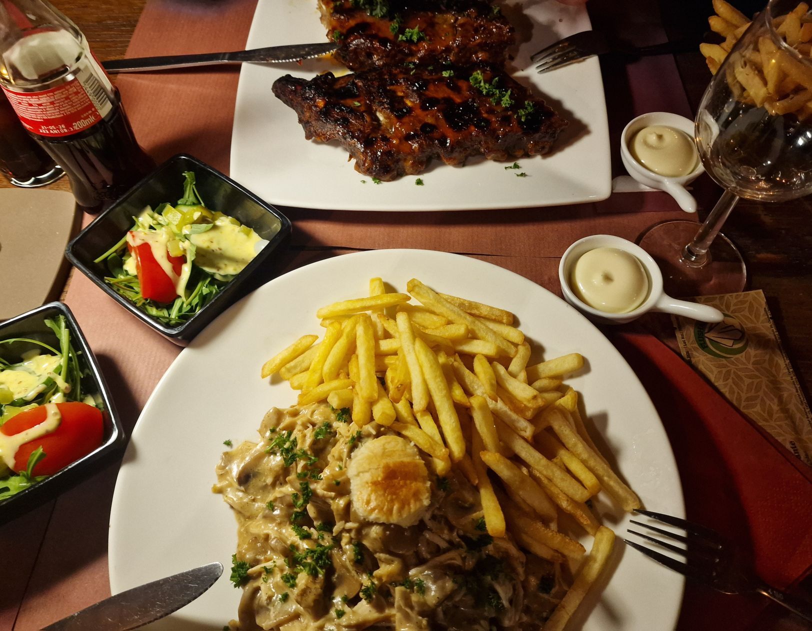 De vorige keren dat we op deze camping waren, kon je er wel iets drinken in het café maar nu kun je er ook eten. We maken het ons makkelijk en gaan het eens proberen. Het is er klein maar wel charmant gezellig. We kunnen nog net een plaatsje aan een tafel krijgen, de rest is gereserveerd. Een koppel dat na ons binnen komt zonder reservatie kan dan ook niet meer gaan zitten. Ik wijs dat het bij ons aan tafel nog kan eventueel. Als ze zouden willen. Het is immers een tafel voor 4 personen. En zo zitten we even later met 2 vreemden aan tafel te eten. Beetje raar, maar soit. Wij verstaan hun niet, zij verstaan ons niet, dus nog privacy genoeg. Luc kiest spareribs, ik kies vol au vent. Boven verwachting lekker, dat moet ik onthouden voor de volgende keer. En eerlijk…. lekkerder dan die ik zelf maak.