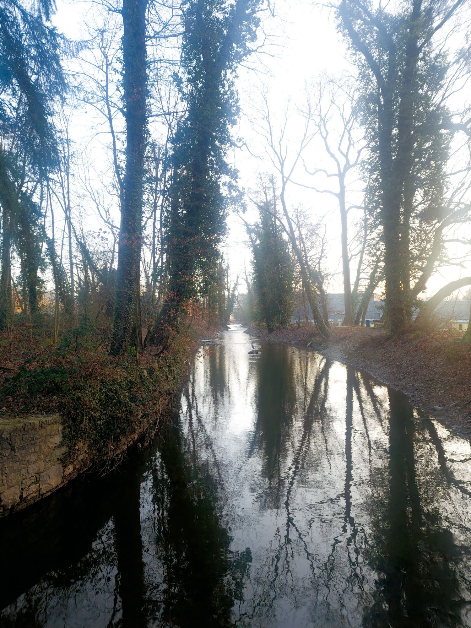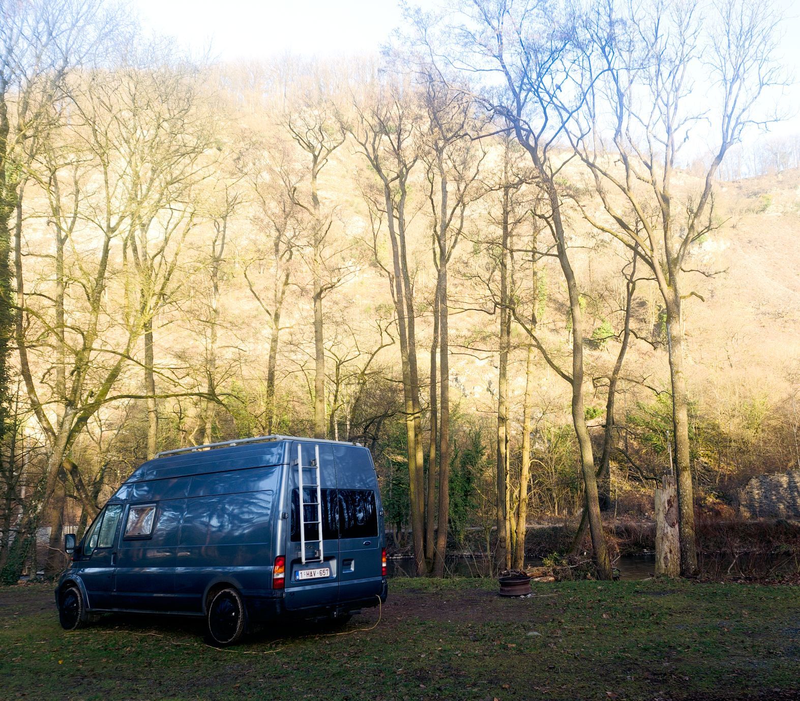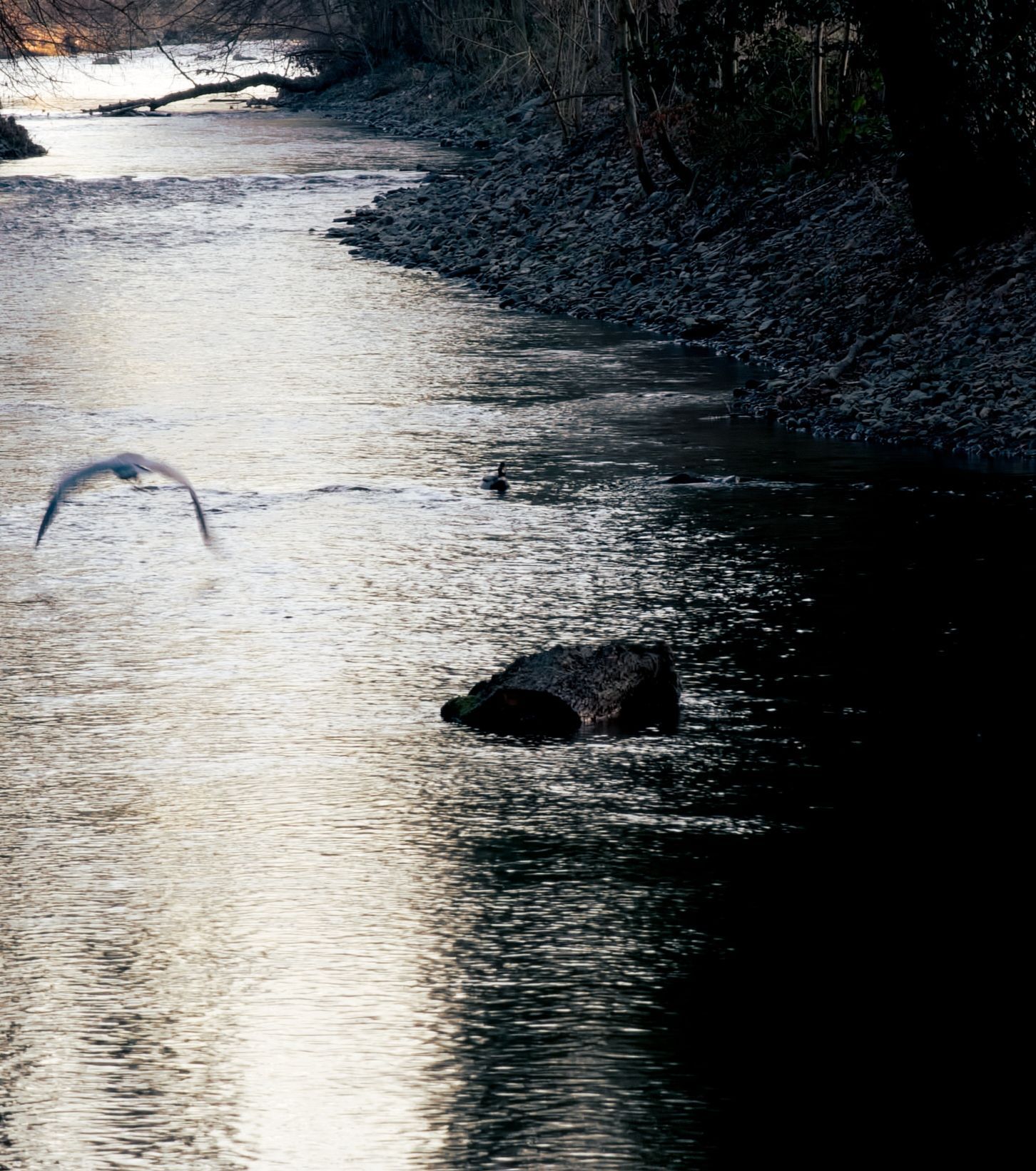 Als de zon wakker wordt, sta ik ook op. Luc draait zich nog een keer om. Ik neem m’n statief mee en wandel het kleine stukje bos naast de camping in. Het is nog stil, op de ook al wakker geworden vogels na. Eendjes laten zich meevoeren door de stroming, een reiger rust uit op een stuk steen dat boven het water uitsteekt. Of zit te loeren naar een visprooi, dat kan ook. Als hij in de gaten krijgt dat ik op het bruggetje sta, vliegt ie weg.