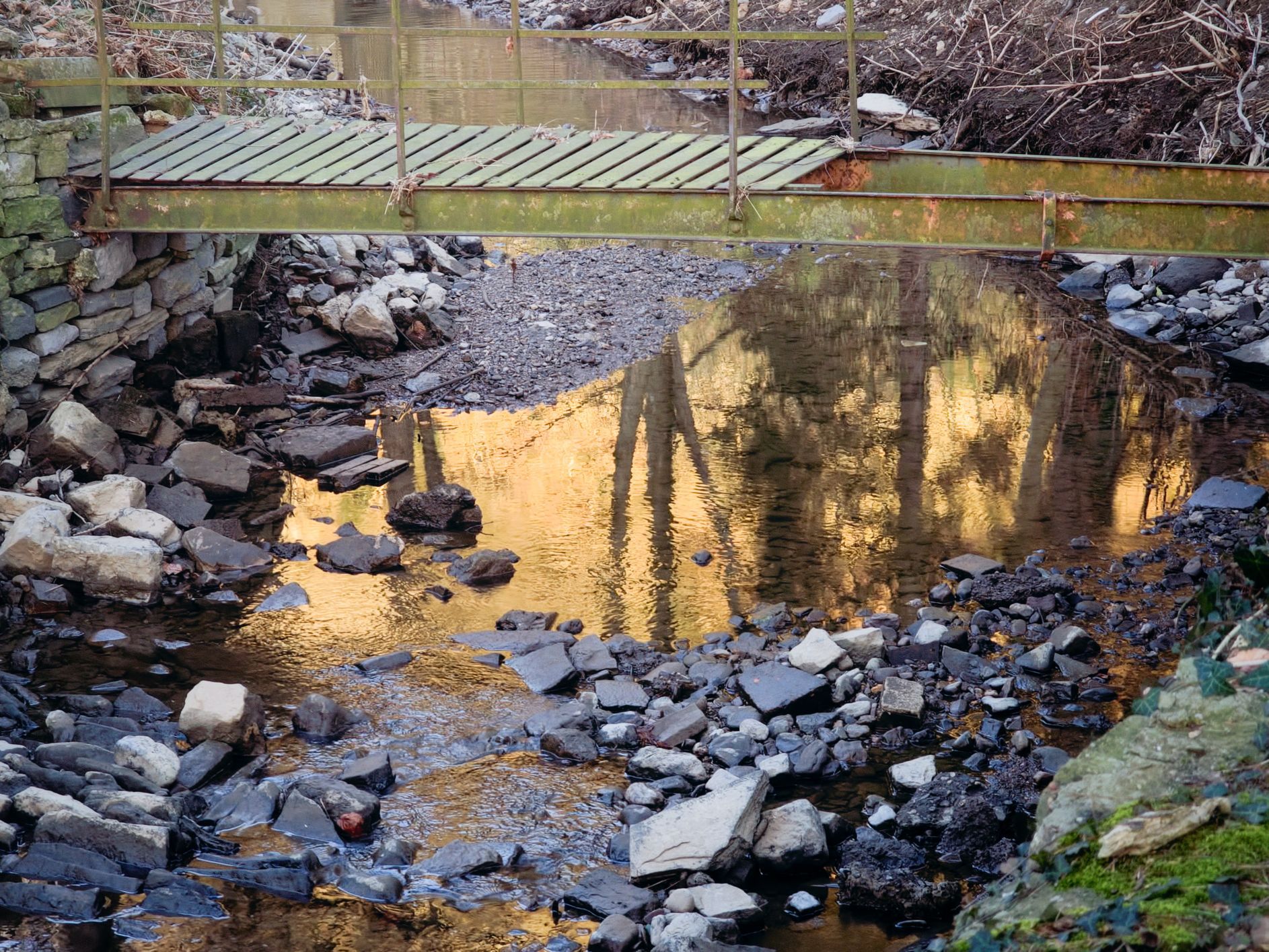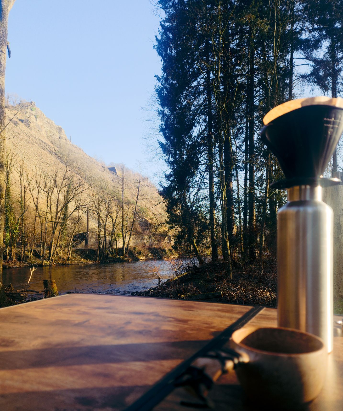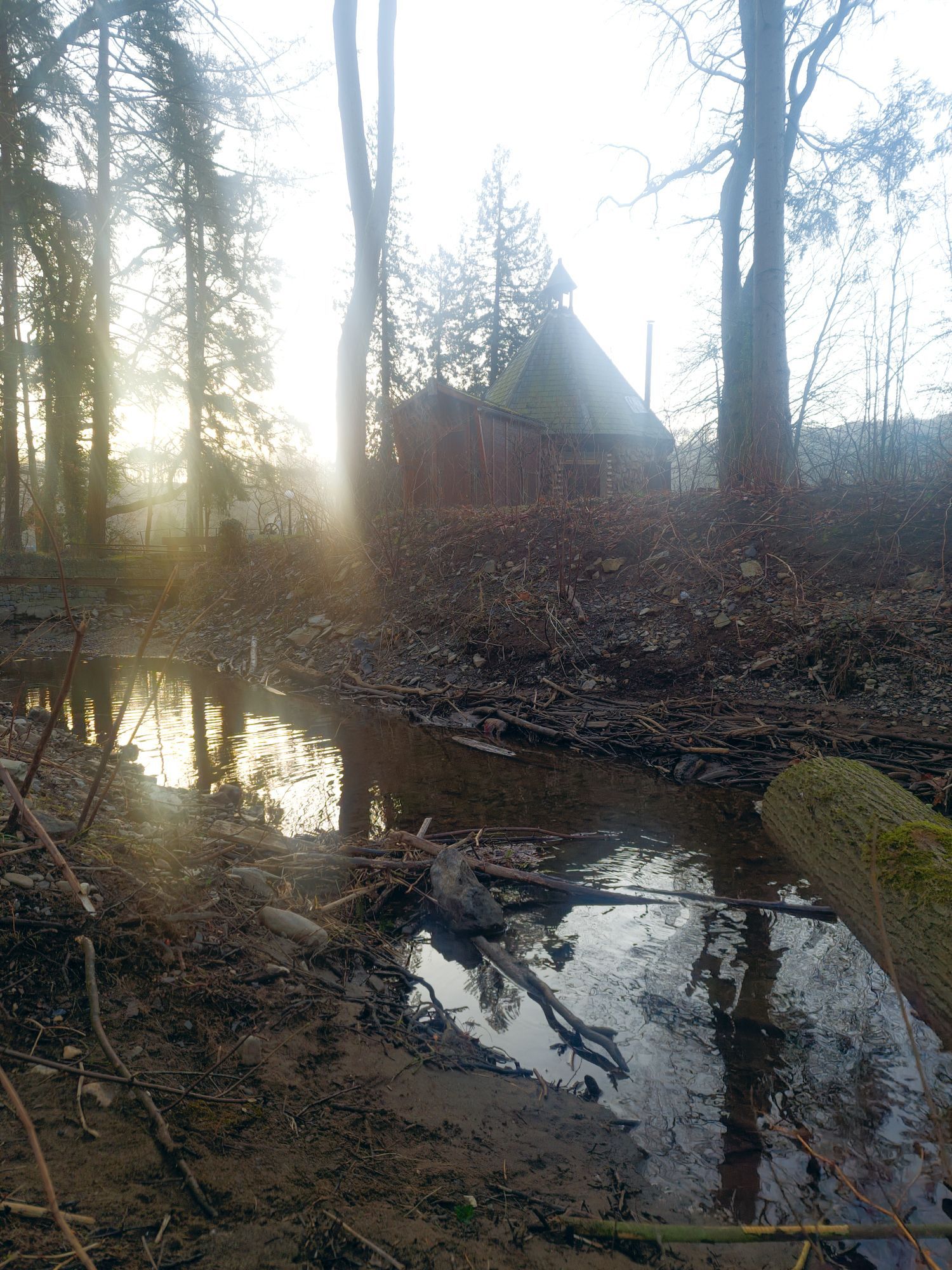 Als de zon wakker wordt, sta ik ook op. Luc draait zich nog een keer om. Ik neem m’n statief mee en wandel het kleine stukje bos naast de camping in. Het is nog stil, op de ook al wakker geworden vogels na. Eendjes laten zich meevoeren door de stroming, een reiger rust uit op een stuk steen dat boven het water uitsteekt. Of zit te loeren naar een visprooi, dat kan ook. Als hij in de gaten krijgt dat ik op het bruggetje sta, vliegt ie weg.