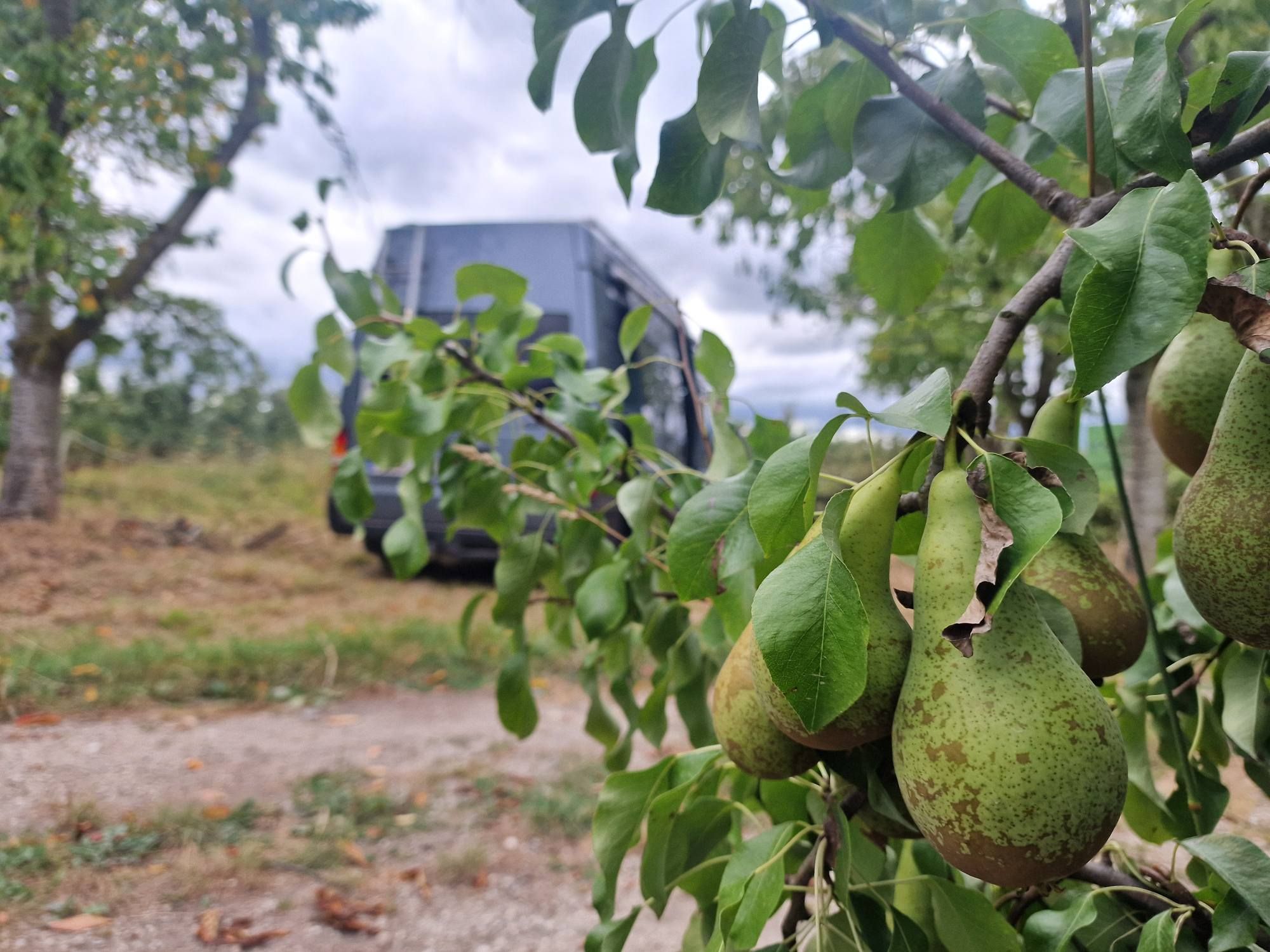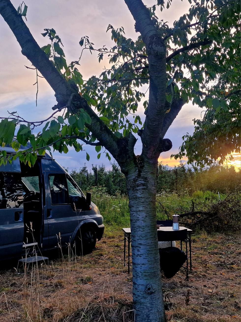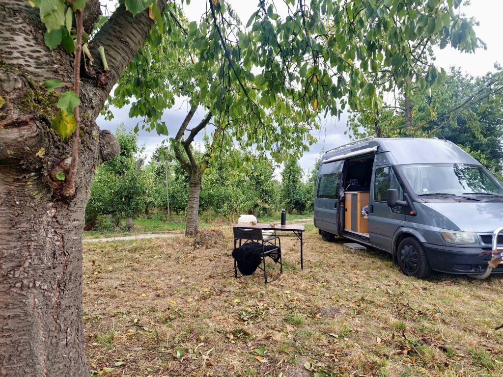 Dat bleek maar schijn te zijn. Net voor vertrek begint het te regenen en hard te waaien. Gelukkig klaart het onderweg op, en na een paar opstoppingen vinden we de plaats. Er is één verharde plek, die laten we dan maar over aan de dochter en vriend morgen. Die hebben tenslotte een ‘echte camper’ bij. Wij installeren ons een stukje verder op het gras. Onder de kersenbomen, momenteel zonder kersen. Links van ons appelbomen, rechts van ons perenbomen. Fruitstreek…. duidelijk.