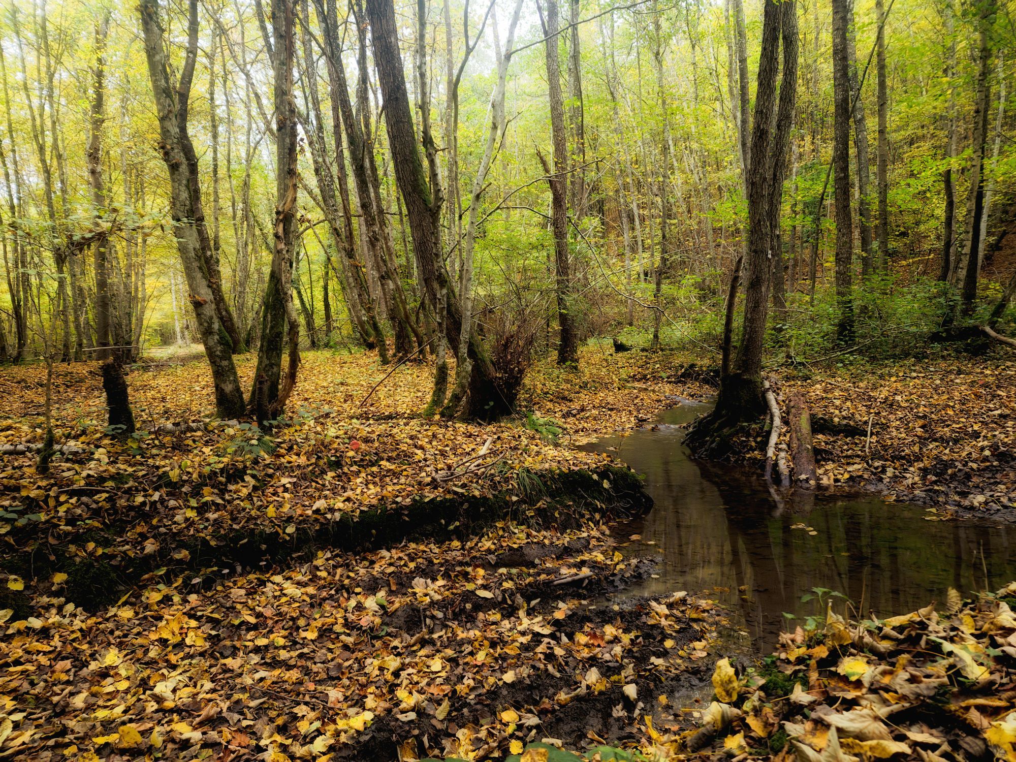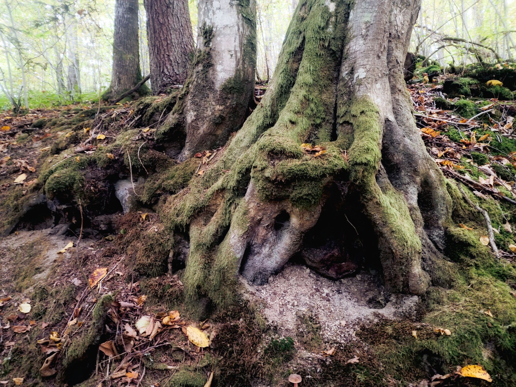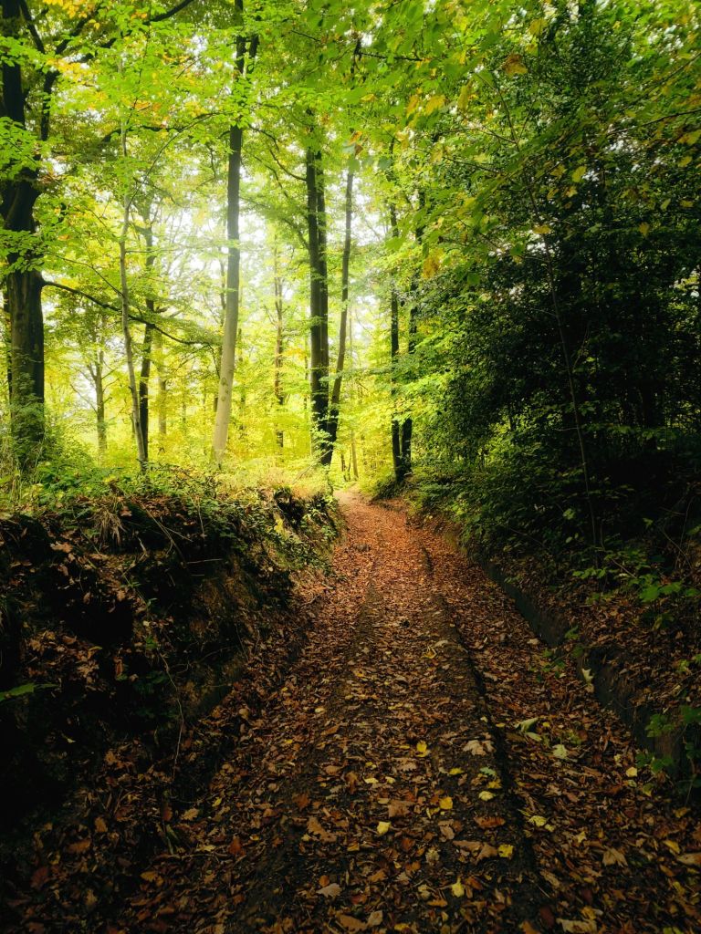 Wij zoeken een wandeling via Komoot die ongeveer vanaf deze plek vertrekt. Vierenhalve kilometer, dus dat is makkelijk te doen. Voor de tweede keer vandaag missen we een paadje, we maken er dus onbedoeld een wandeling van vijfenhalve kilometer van. Het is een boswandeling, met hier en daar langere stukken klimmend, dus voor ondergetekende een uitdaging. Al gauw heb ik geen jas meer nodig. De rest van de kleding in principe ook niet meer, maar die hou ik voor de zekerheid toch aan. Luc heeft nergens last van, zelfs niet met shirt, dikke trui én jas.