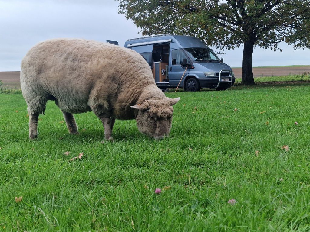De eigenaar komt het veld op. Hij stelt zich voor en legt uit waar we de toiletten, douche en afwasplek kunnen vinden. Dan vertrekt hij om een eindje te gaan fietsen. Wij verkennen ondertussen het terrein. Een stukje speelbos voor de kinderen. (En voor de groten). Het toilet- en douchegebouwtje. Een chalet dat je als vakantiehuisje kunt huren. Een tweetal schapen wonen hier ook. Het lijken wel kebabrollen op pootjes, zo groot en rond zijn ze.