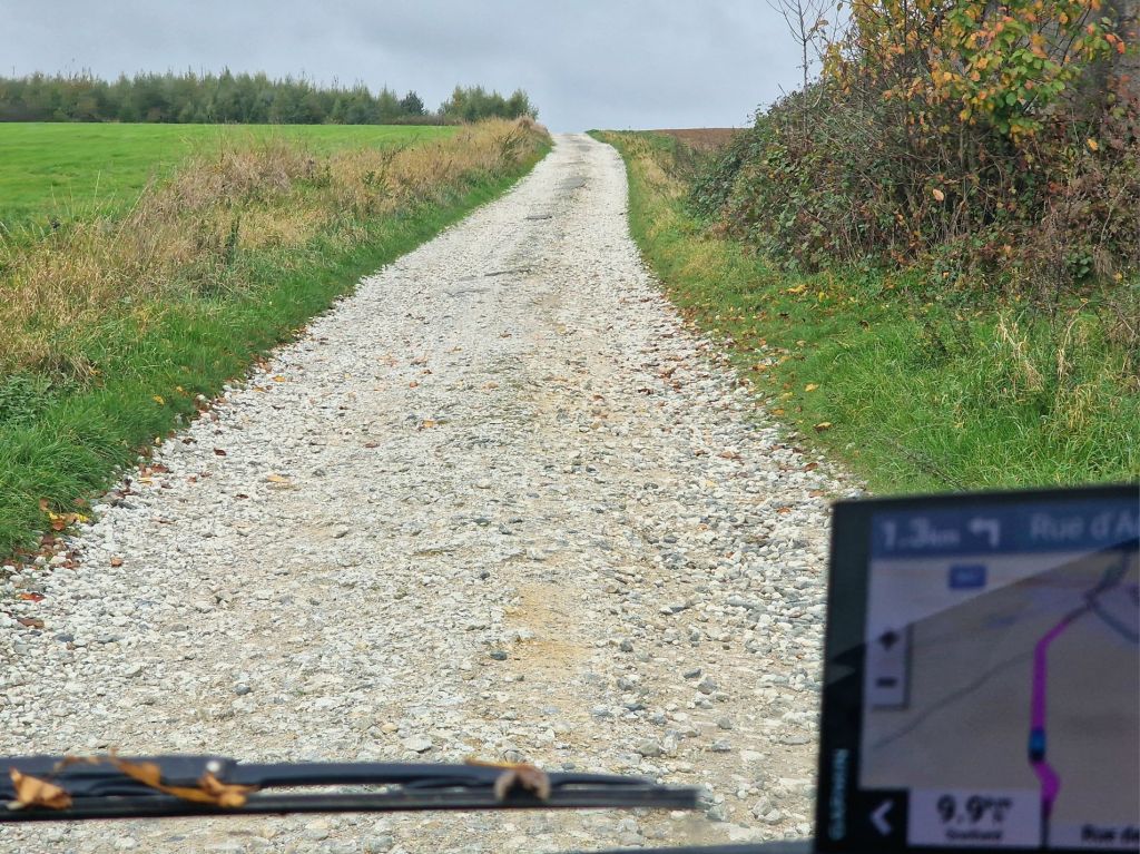 Stipt 10 voor 12 rijden we van de camping af. Geen zin in de 10-euro-boete als je te laat vertrekt. Deze boodschap werd duidelijk vermeld op een briefje aan de toiletdeur. We zetten de navigatie op Rosée Florennes, de radio op studio Brussel, en we kiezen deze keer voor de route via snelweg. We zijn benieuwd naar onze geboekte plek. We missen het zijstraatje en rijden eerst nog eens een kilometer of 10 te ver. Teruggedraaid, en dan gaat het wél goed. Het laatste stuk is een redelijk hobbelige zandweg met losse stenen. Leuk!