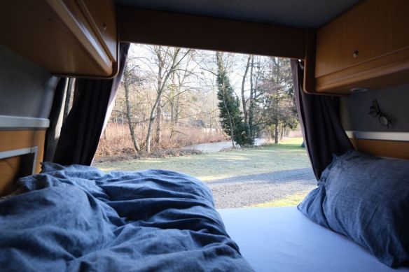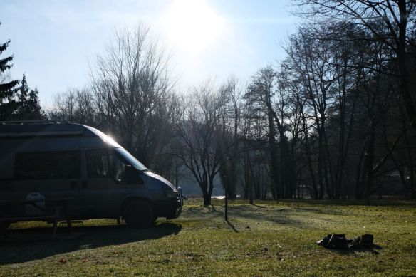 Op zondagochtend schijnt de zon. Het vriest nog wel, er staat ijs op de ramen. Gelukkig hebben we ’s nachts onder de dekens geen last van de kou. We drinken koffie, en ik maak nog snel wat foto’s van de plek, en dan pakken we in. Vóór 11 uur moeten we van de camperplaats af, anders moeten we opnieuw betalen. Om kwart voor 11 rijden we naar de uitgang en gaat de slagboom open.